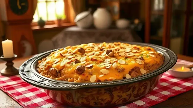 Bake: Pour the mixture into a lightly greased 3-quart casserole dish or a 9x13 baking pan. Top with sliced almonds for added crunch.