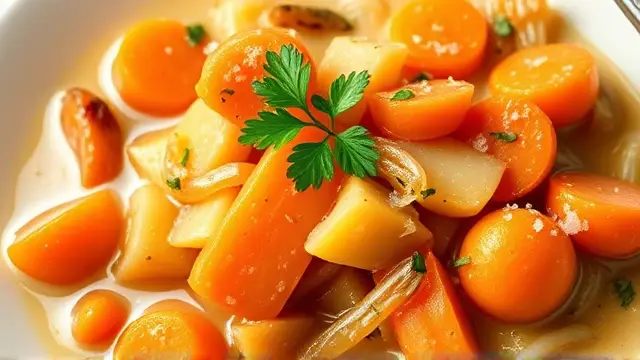 # Kae's Delightful Swiss Carrots 🥕✨ This simple and flavorful recipe for Swiss Carrots is a delightful side dish that perfectly complements any meal. The combination of sweet carrots and sautéed onions creates a harmony of flavors that will have your taste buds dancing! It's a quick dish that's perfect for busy weeknights or festive gatherings. Pair it with your favorite protein for a nutritious and colorful plate! 🍽️ ## Ingredients - 1 bunch of fresh carrots - 1 medium onion, finely chopped - 1 tablespoon of butter - 1 teaspoon of sugar - ½ cup of water ## Instructions 1. Start by scraping the carrots and cutting them into thin slices or small sticks. 2. In a heavy saucepan, melt the butter over medium heat and sauté the chopped onion until it becomes transparent and fragrant. > 🔥 Sautéing the onions before adding the carrots enhances their sweetness and adds depth to the dish. 3. Add the sliced carrots, water, and sugar to the saucepan. Stir to combine, then cover the pot. 4. Cook for 10 to 12 minutes, allowing the carrots to steam until they are tender but still slightly crisp. 5. When the carrots are almost done, remove the lid to let the remaining liquid be absorbed and intensify the flavors. 6. Serve warm and enjoy the deliciousness! > 🍽️ This dish serves about 6 but can easily be doubled or halved depending on your needs. ## Tips for Success - **Carrot Varieties**: Feel free to experiment with different types of carrots—rainbow or baby carrots add a fun twist and vibrant colors! - **For a Touch of Spice**: Add a pinch of freshly grated nutmeg or a sprinkle of red pepper flakes for an extra flavor layer. - **Make it a Meal**: Serve these Swiss Carrots alongside roasted chicken or fish for a complete and satisfying dinner. ## Variations - **Herb Infused**: Stir in some fresh herbs like parsley or thyme towards the end of cooking for added freshness. 🌿 - **Honey Glazed**: Substitute the sugar with honey for a floral sweetness that complements the carrots beautifully. - **Creamy Version**: For a richer side dish, stir in a splash of cream just before serving. With Kae's Swiss Carrots, you get a colorful, healthy dish that's both easy to prepare and a crowd-pleaser. Enjoy your cooking! 🥕❤️name