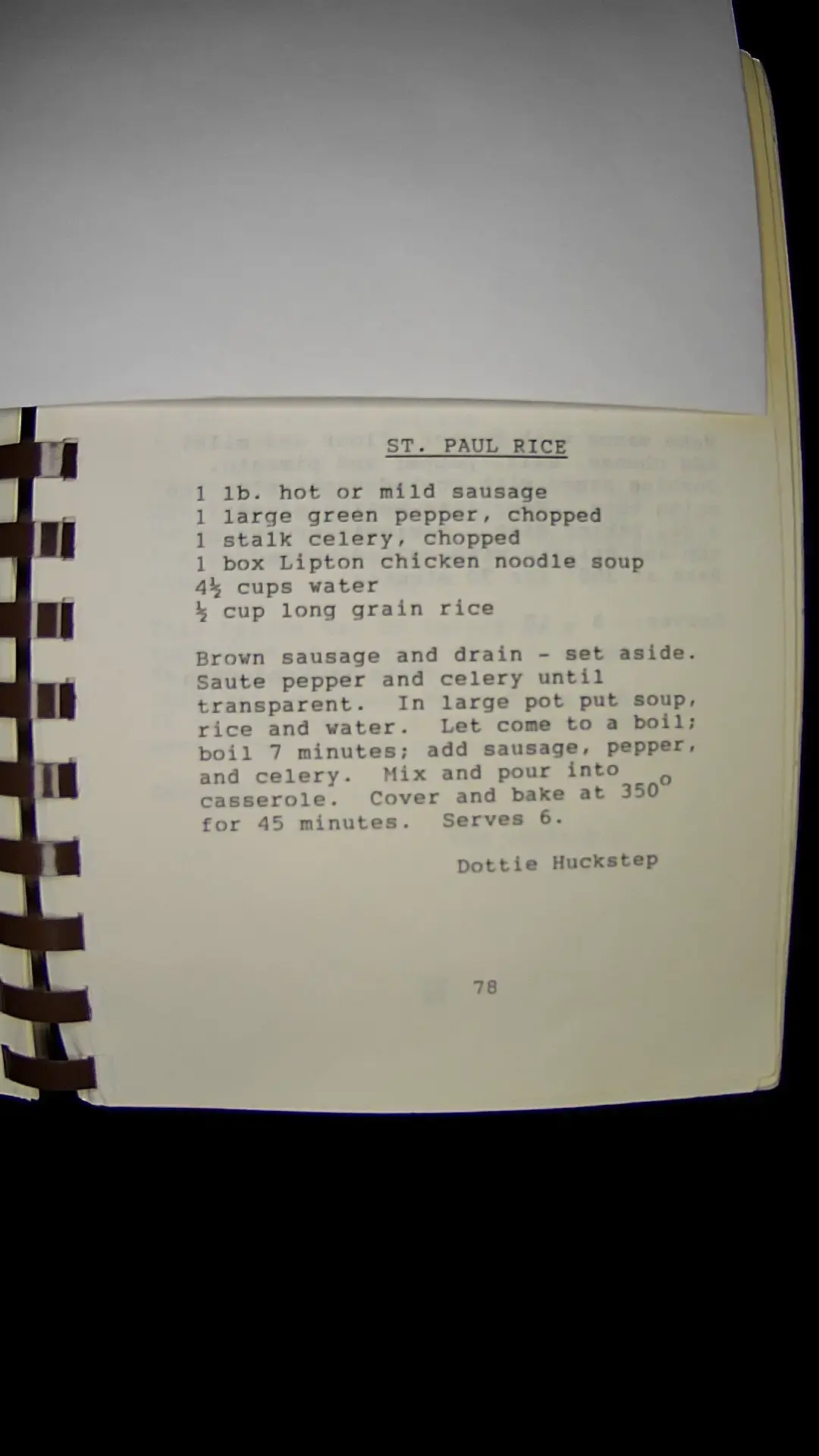Here’s the text from the image: **ST. PAUL RICE** - 1 lb. hot or mild sausage - 1 large green pepper, chopped - 1 stalk celery, chopped - 1 box Lipton chicken noodle soup - 4½ cups water - ½ cup long grain rice **Instructions:** Brown sausage and drain – set aside. Saute pepper and celery until transparent. In a large pot, put soup, rice, and water. Let come to a boil; boil 7 minutes; add sausage, pepper, and celery. Mix and pour into casserole. Cover and bake at 350° for 45 minutes. Serves 6. Dottie Huckstep **Page 78**llm