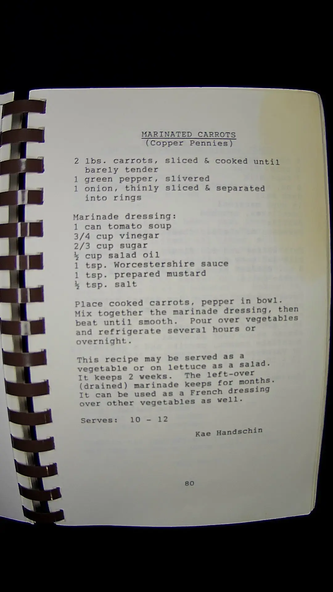 Here's the text from the image: --- **MARINATED CARROTS** *(Copper Pennies)* 2 lbs. carrots, sliced & cooked until barely tender 1 green pepper, slivered 1 onion, thinly sliced & separated into rings **Marinade dressing:** 1 can tomato soup 3/4 cup vinegar 2/3 cup sugar 1/2 cup salad oil 1 tsp. Worcestershire sauce 1 tsp. prepared mustard 1/2 tsp. salt Place cooked carrots, pepper in bowl. Mix together the marinade dressing, then beat until smooth. Pour over vegetables and refrigerate several hours or overnight. This recipe may be served as a vegetable or on lettuce as a salad. It keeps 2 weeks. The left-over (drained) marinade keeps for months. It can be used as a French dressing over other vegetables as well. **Serves: 10 - 12** Kae Handschin 80llm