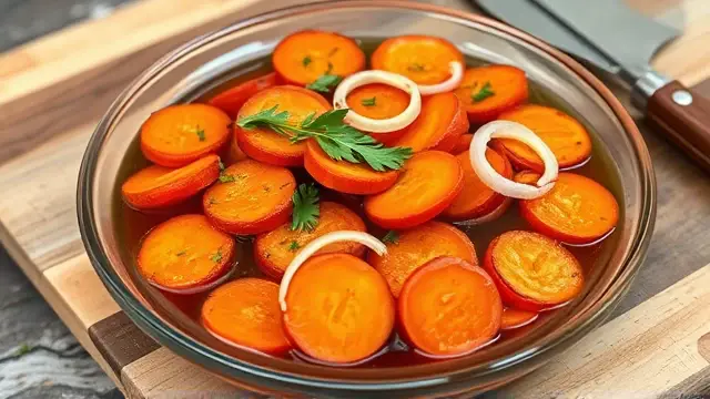 # Kae's Delightful Copper Pennies (Marinated Carrots) 🥕✨ Transform your gatherings with this vibrant and tangy marinated carrot dish! Known as Copper Pennies, it's not just a side—it's a refreshing salad that can jazz up any meal. The sweetness of the carrots combined with the zesty marinade is sure to be a crowd-pleaser. Perfect for picnics or potlucks, and the best part? It can be made ahead of time and stored for weeks! ## Ingredients ### For the carrot salad - 2 lbs carrots, sliced & cooked until barely tender - 1 green pepper, slivered - 1 onion, thinly sliced & separated into rings ### For the marinade dressing - 1 can tomato soup - 3/4 cup vinegar (apple cider or white vinegar works great!) - 2/3 cup sugar - 1/2 cup salad oil (olive oil adds a nice flavor) - 1 tsp Worcestershire sauce - 1 tsp prepared mustard - 1/2 tsp salt ## Instructions 1. **Prepare the veggies**: In a large bowl, combine the cooked carrots, slivered green pepper, and onion rings. 2. **Make the marinade**: In a separate bowl, whisk together the tomato soup, vinegar, sugar, salad oil, Worcestershire sauce, prepared mustard, and salt. Beat until smooth and fully combined. > 🥗 Pro Tip: For a little extra kick, consider adding a pinch of black pepper or a dash of hot sauce to the marinade for a spicy twist! 3. **Combine**: Pour the marinade over the vegetables, ensuring everything is well coated. 4. **Chill**: Cover the bowl and refrigerate for several hours or overnight. This allows the flavors to meld beautifully. > ❄️ Note: The longer it sits, the tastier it gets! ## Serving Suggestions - Serve as a chilled vegetable side dish, or arrange atop fresh lettuce as a vibrant salad. Perfect for summertime barbecues! - This dish can be kept in the refrigerator for up to 2 weeks. ## Creative Uses - **Leftover Marinade**: Don’t toss it! The drained marinade lasts for months and works as a fantastic dressing for other salads or steamed veggies. - **Add Protein**: To make it more filling, add roasted chickpeas or diced grilled chicken when serving as a salad! **Serves**: 10 - 12 Kae Handschin's classic recipe is perfect for any meal—give it a try and watch it disappear from the table! 😍🥕name