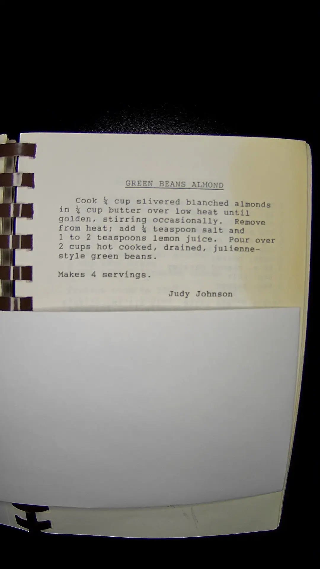 The text in the image reads: **GREEN BEANS ALMOND** Cook Β½ cup slivered blanched almonds in Β½ cup butter over low heat until golden, stirring occasionally. Remove from heat; add ΒΌ teaspoon salt and 1 to 2 teaspoons lemon juice. Pour over 2 cups hot cooked, drained, julienne-style green beans. Makes 4 servings. Judy Johnsonllm