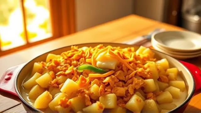 # Barbara's Cottage Potatoes 🥔🧀 This comforting dish is a hearty side that’s perfect for family gatherings or cozy dinners. Combining tender potatoes with American cheese and a crunchy topping, it’s a favorite that brings a taste of home. You can even prepare it ahead of time for extra convenience! ## Ingredients ### For the base - 10 large potatoes, cooked and diced - 2 slices of bread, torn into pieces - 1 large green pepper, diced - 1 large onion, diced - ½ lb. American cheese (about 10 slices), diced - Salt & pepper, to taste ### For the topping - ½ cup melted butter - Milk (enough to fill dish to half depth) - Corn flakes (for crunch) ## Instructions 1. **Combine**: In a large mixing bowl, combine the cooked and diced potatoes, torn bread, green pepper, onion, and diced cheese. Season with salt and pepper to taste. > 🥄 Tip: Mix gently to maintain the texture of the potatoes while ensuring all ingredients are well distributed. 2. **Layer**: Pour the melted butter over the mixture and stir until everything is coated. 3. **Milk It Up**: Add milk to the mixture until it fills the dish to half depth. This will keep the potatoes moist while baking. 4. **Top It Off**: Crumble corn flakes generously over the top for that crunchy finish. 5. **Bake**: Preheat your oven to 350°F (175°C) and bake for 1 hour or until golden and bubbly. > ⏰ Pro Tip: You can prepare this dish a day in advance; simply cover and refrigerate, omitting the milk and melted butter until ready to bake. ## Serving Suggestions - This dish pairs wonderfully with grilled meats, roasted veggies, or a fresh green salad. - Add a sprinkle of fresh herbs, like parsley or chives, for a pop of color and added flavor! ## Variations - **Cheesy Twist**: Substitute the American cheese with cheddar or pepper jack for a different flavor profile. - **Vegetarian Delight**: Add cooked mushrooms or spinach for extra nutrition and to elevate the dish! - **Make it Zesty**: Mix in a teaspoon of garlic powder or some hot sauce to spice things up! ## Storage Tips - Leftovers can be stored in an airtight container in the refrigerator for up to 3 days. Reheat in the oven for the best texture! Enjoy the homestyle goodness of Barbara's Cottage Potatoes at your next meal! 🥘💖name