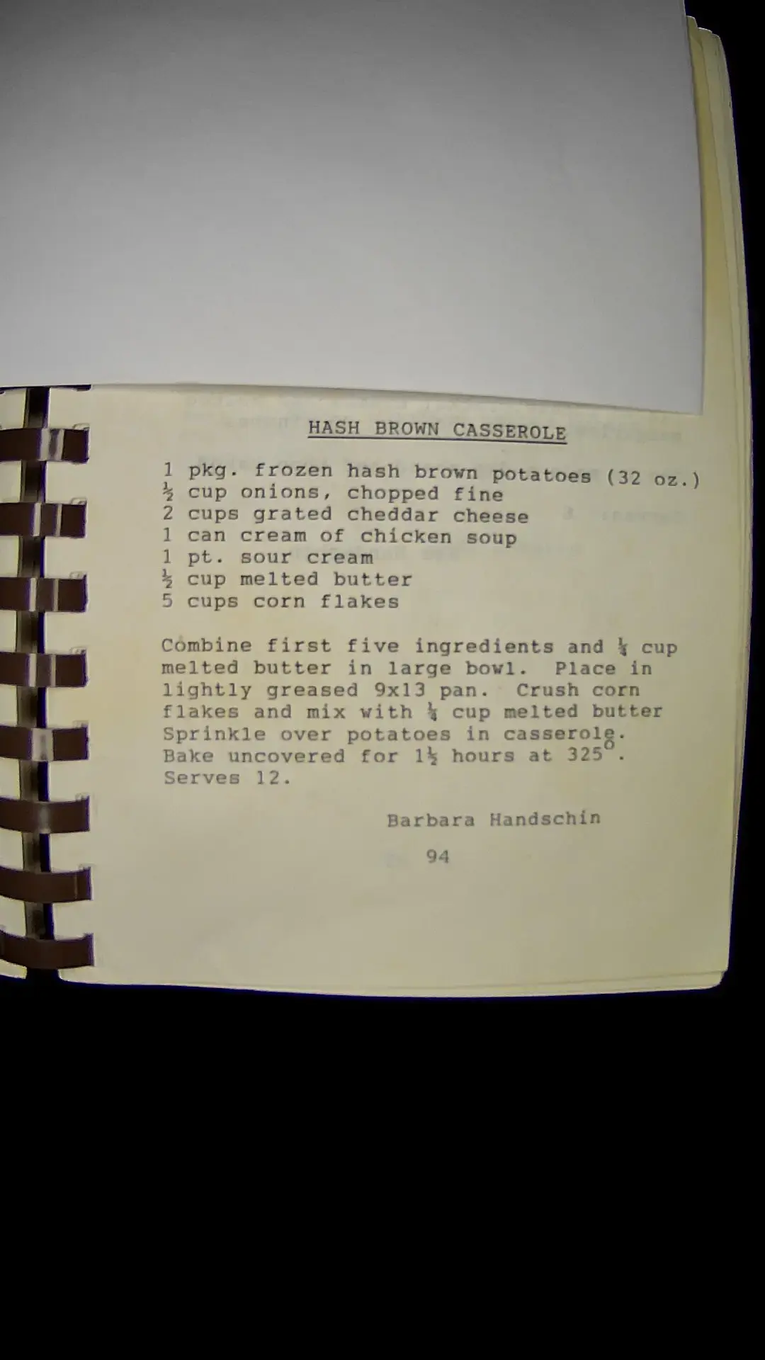 Here's the text from the image: **HASH BROWN CASSEROLE** - 1 pkg. frozen hash brown potatoes (32 oz.) - ½ cup onions, chopped fine - 2 cups grated cheddar cheese - 1 can cream of chicken soup - 1 pt. sour cream - ½ cup melted butter - 5 cups corn flakes Combine first five ingredients and ½ cup melted butter in a large bowl. Place in lightly greased 9x13 pan. Crush corn flakes and mix with ½ cup melted butter. Sprinkle over potatoes in casserole. Bake uncovered for 1½ hours at 325°F. Serves 12. Barbara Handschin 94llm