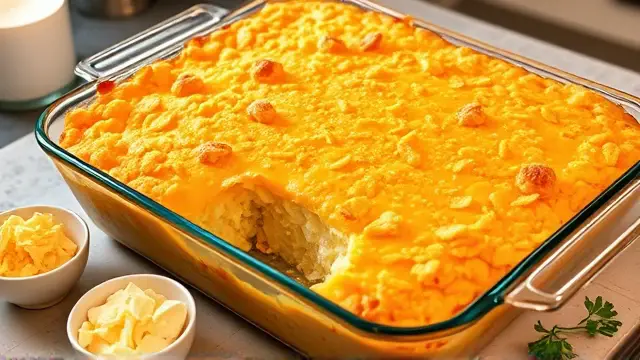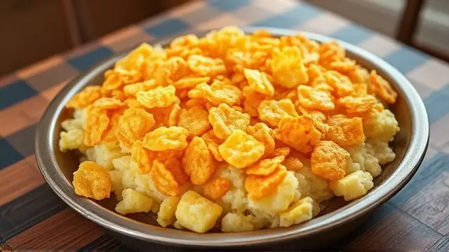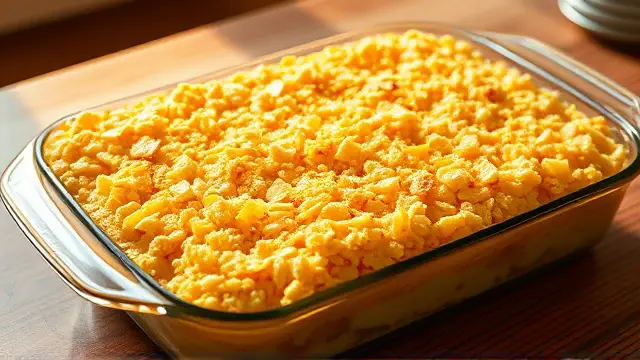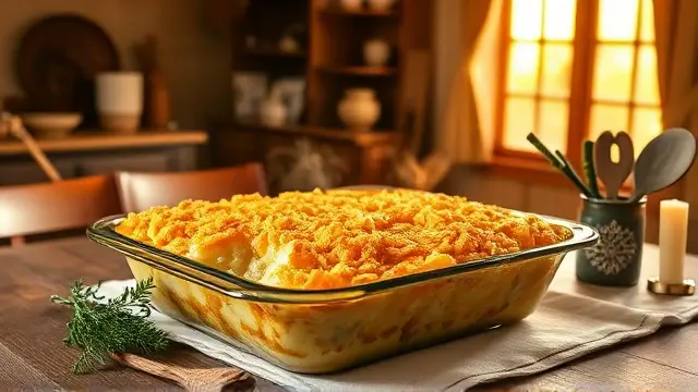 # Barbara's Ultimate Hash Brown Casserole 🥔🧀 This hearty and delicious hash brown casserole is perfect for brunch, potlucks, or a cozy family dinner. It's creamy, cheesy, and has a satisfying crunch on top, making it a favorite at every gathering. You can prepare it ahead of time and just pop it in the oven when you're ready to serve. Grab a fork and enjoy every cheesy bite! 🍽️ ## Ingredients - **For the casserole base** - 1 pkg. (32 oz.) frozen hash brown potatoes - ½ cup onions, finely chopped - 2 cups grated cheddar cheese - 1 can (10.5 oz) cream of chicken soup - 1 pint sour cream - ½ cup melted butter - **For the topping** - 5 cups corn flakes, crushed - ½ cup melted butter ## Instructions 1. Preheat your oven to 325°F (165°C). 2. In a large bowl, combine the frozen hash browns, chopped onions, cheddar cheese, cream of chicken soup, sour cream, and ½ cup of melted butter. Mix well until everything is evenly coated. > 🔄 **Tip**: For extra flavor, try sautéing your onions in a bit of butter before adding them. This will enhance the overall taste of your casserole! 3. Pour the mixture into a lightly greased 9x13 inch baking dish, spreading it evenly. 4. In a separate bowl, crush the corn flakes and mix them with the remaining ½ cup of melted butter. > 🥄 **Secret Step**: Use a zip-lock bag to crush the corn flakes for less mess and more fun! 5. Sprinkle the buttery corn flake mixture over the hash brown layer. 6. Bake uncovered for about 1½ hours, or until the top is golden brown and crispy. 7. Allow to cool slightly before serving. Enjoy your creamy, cheesy creation! > 🍽️ **Serving Suggestion**: This casserole pairs wonderfully with scrambled eggs and fresh fruit for a well-rounded brunch. ## Variations - **Vegetarian**: Opt for a cream of mushroom soup and add some sautéed mushrooms or spinach for a veggie boost. 🌱 - **Spicy**: Add a few diced jalapeños or a dash of hot sauce to the mixture for a kick! - **Breakfast Twist**: Crack a few eggs into the mix to create a breakfast casserole that's packed with protein. - **Make-Ahead**: Assemble the casserole the night before and refrigerate. Just pop it in the oven straight from the fridge in the morning! Enjoy this delightful hash brown casserole at your next gathering or as a comforting meal at home! 😋name