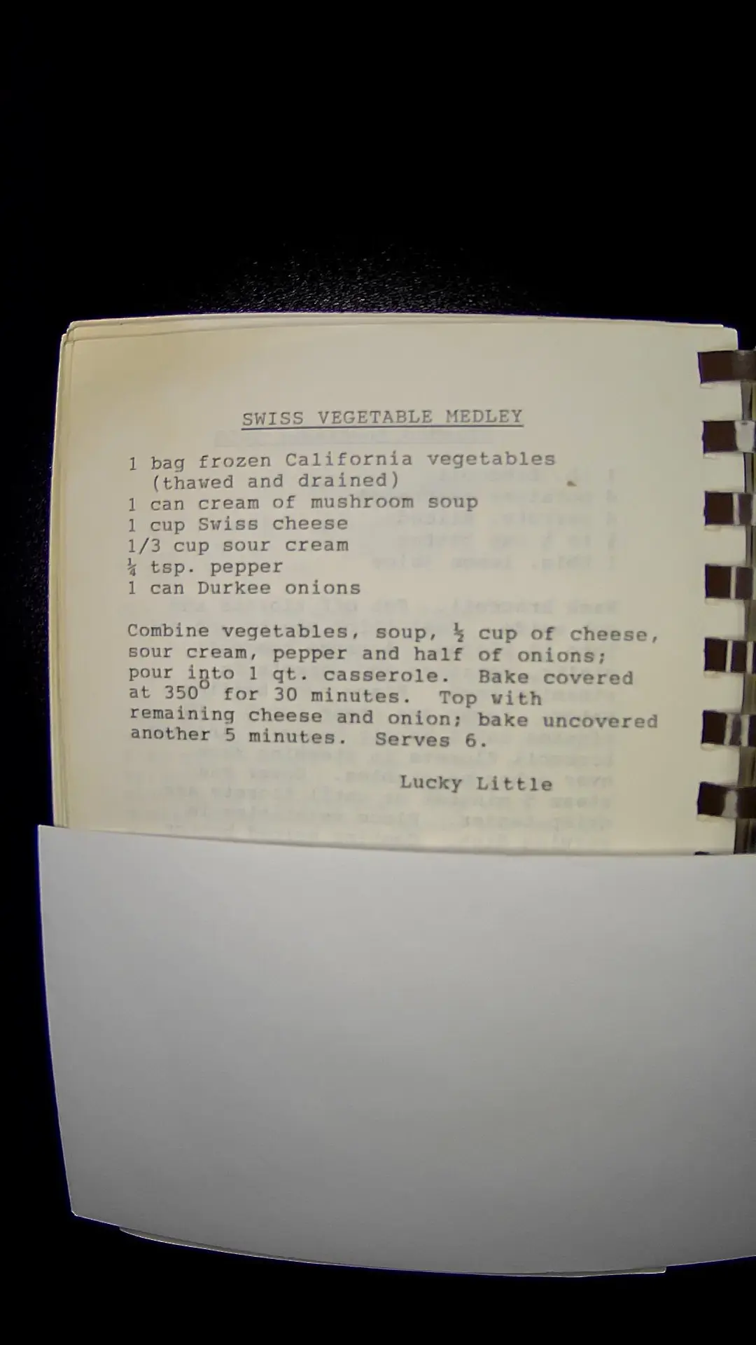 Here’s the text from the image: **SWISS VEGETABLE MEDLEY** - 1 bag frozen California vegetables (thawed and drained) - 1 can cream of mushroom soup - 1 cup Swiss cheese - 1/3 cup sour cream - ¾ tsp. pepper - 1 can Durkee onions **Instructions:** Combine vegetables, soup, ½ cup of cheese, sour cream, pepper and half of onions; pour into 1 qt. casserole. Bake covered at 350°F for 30 minutes. Top with remaining cheese and onion; bake uncovered another 5 minutes. Serves 6. *Lucky Little*llm