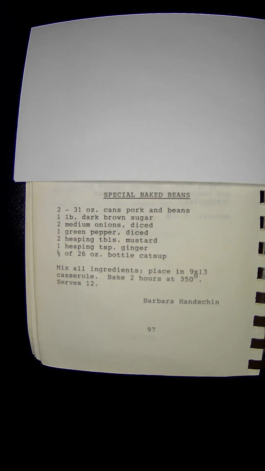 Here’s the text from the image: **SPECIAL BAKED BEANS** - 2 - 31 oz. cans pork and beans - 1 lb. dark brown sugar - 2 medium onions, diced - 1 green pepper, diced - 2 heaping tbls. mustard - 1 heaping tsp. ginger - ½ of 26 oz. bottle catsup Mix all ingredients; place in 9x13 casserole. Bake 2 hours at 350°. Serves 12. Barbara Handschin 97llm