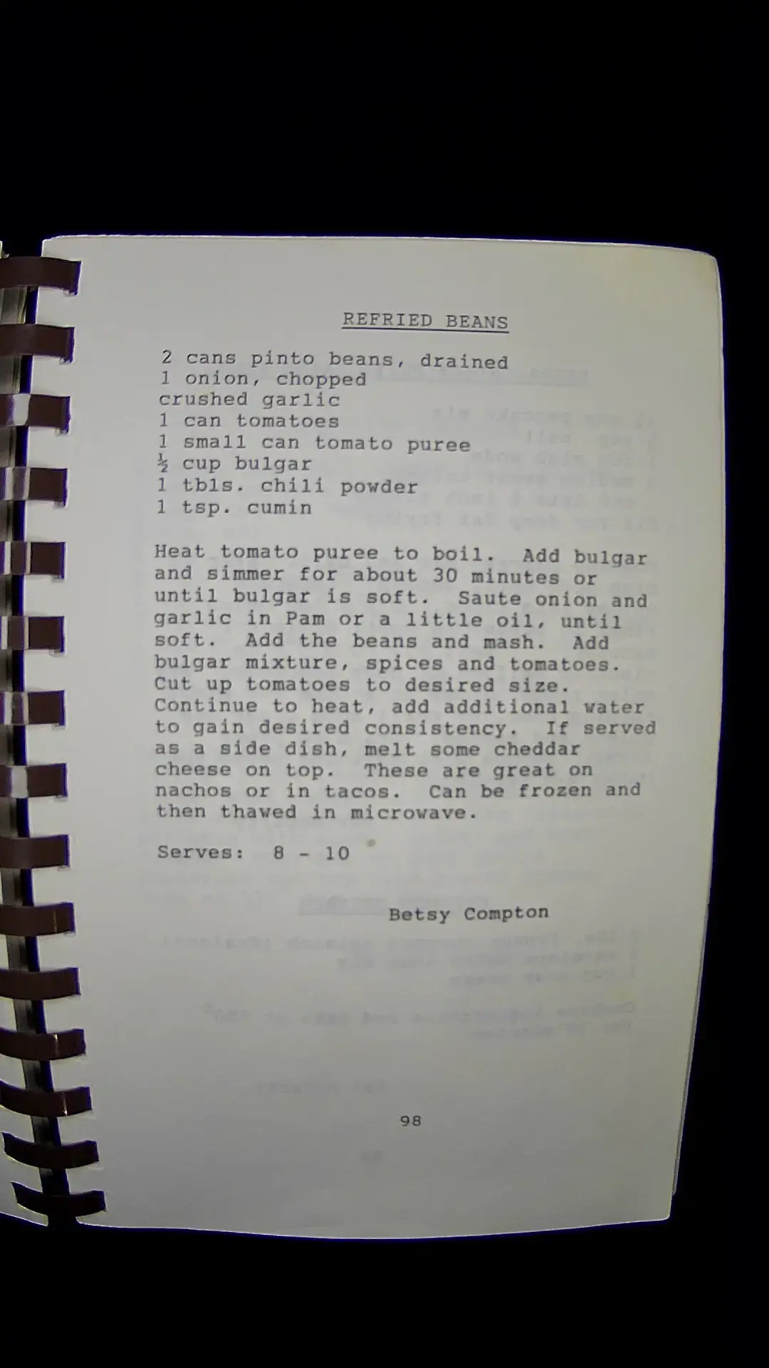 Here’s the text from the image: --- **REFRIED BEANS** - 2 cans pinto beans, drained - 1 onion, chopped - crushed garlic - 1 can tomatoes - 1 small can tomato puree - ½ cup bulgar - 1 tbls. chili powder - 1 tsp. cumin **Instructions:** Heat tomato puree to boil. Add bulgar and simmer for about 30 minutes or until bulgar is soft. Saute onion and garlic in Pam or a little oil, until soft. Add the beans and mash. Add bulgar mixture, spices, and tomatoes. Cut up tomatoes to desired size. Continue to heat, add additional water to gain desired consistency. If served as a side dish, melt some cheddar cheese on top. These are great on nachos or in tacos. Can be frozen and then thawed in microwave. **Serves: 8 - 10** Betsy Compton --- Page 98llm