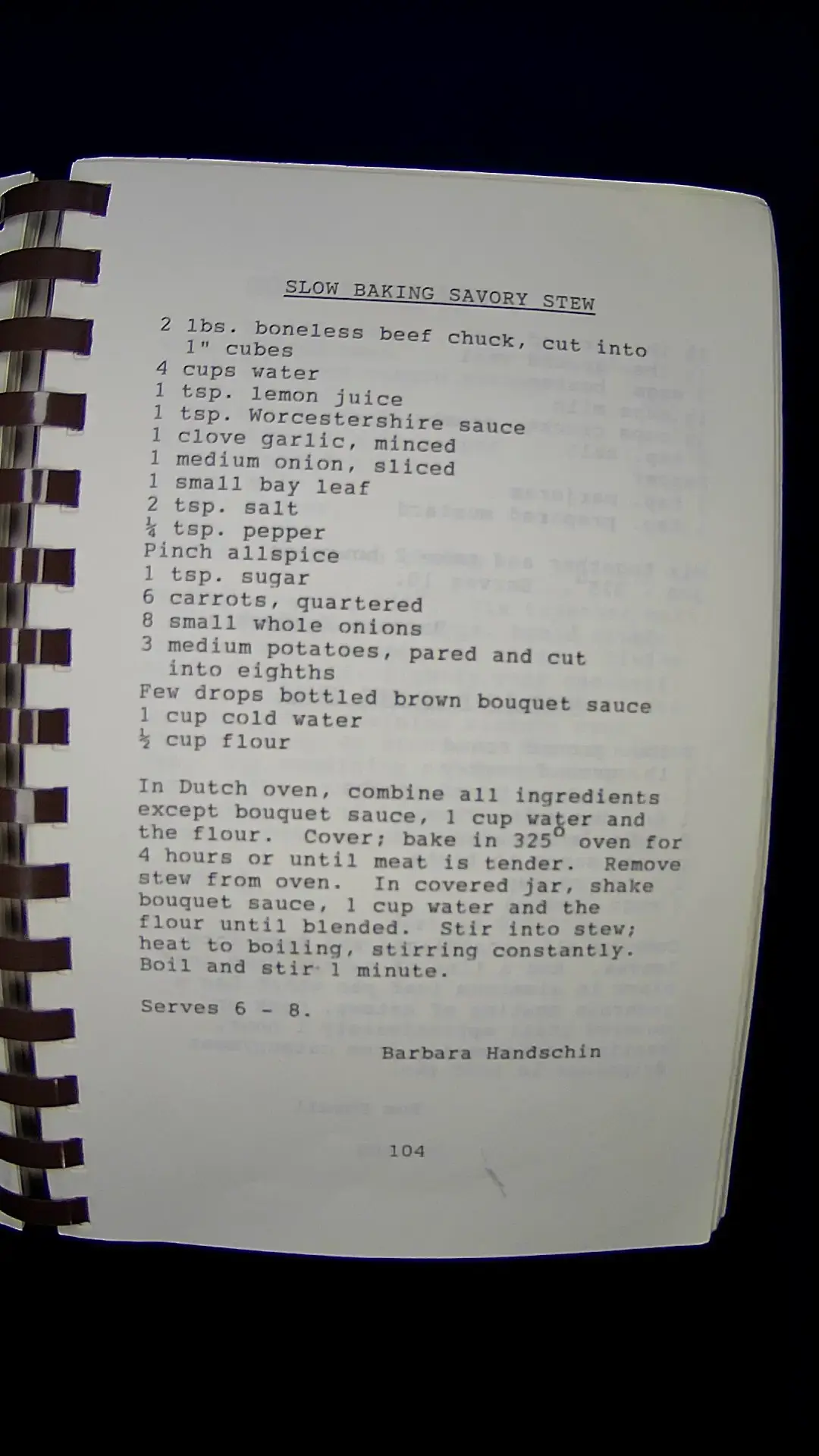 Here's the text from the image: **SLOW BAKING SAVORY STEW** - 2 lbs. boneless beef chuck, cut into 1" cubes - 4 cups water - 1 tsp. lemon juice - 1 tsp. Worcestershire sauce - 1 clove garlic, minced - 1 medium onion, sliced - 1 small bay leaf - 2 tsp. salt - ¼ tsp. pepper - Pinch allspice - 1 tsp. sugar - 6 carrots, quartered - 8 small whole onions - 3 medium potatoes, pared and cut into eighths - Few drops bottled brown bouquet sauce - 1 cup cold water - ½ cup flour **Instructions:** In Dutch oven, combine all ingredients except bouquet sauce, 1 cup water, and the flour. Cover; bake in 325° oven for 4 hours or until meat is tender. Remove stew from oven. In covered jar, shake bouquet sauce, 1 cup water, and the flour until blended. Stir into stew; heat to boiling, stirring constantly. Boil and stir 1 minute. **Serves 6 - 8.** **Barbara Handschin** **104**llm