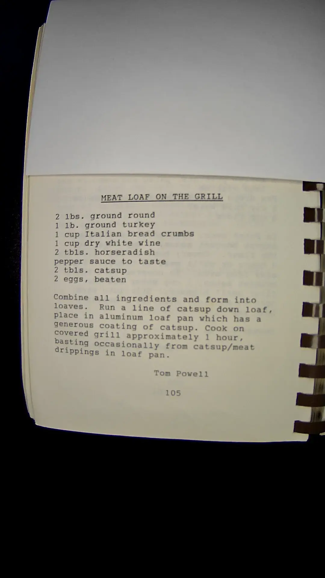 Here's the text from the image: --- **MEAT LOAF ON THE GRILL** 2 lbs. ground round 1 lb. ground turkey 1 cup Italian bread crumbs 1 cup dry white wine 2 tbls. horseradish pepper sauce to taste 2 tbls. catsup 2 eggs, beaten Combine all ingredients and form into loaves. Run a line of catsup down loaf, place in aluminum loaf pan which has a generous coating of catsup. Cook on covered grill approximately 1 hour, basting occasionally from catsup/meat drippings in loaf pan. Tom Powell 105 ---llm