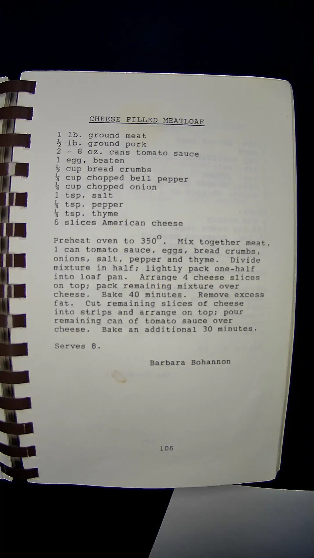 Here's the text from the image: ### Cheese Filled Meatloaf **Ingredients:** - 1 lb. ground meat - ½ lb. ground pork - 2 - 8 oz. cans tomato sauce - 1 egg, beaten - ¾ cup bread crumbs - ½ cup chopped bell pepper - ½ cup chopped onion - 1 tsp. salt - ¼ tsp. pepper - ¼ tsp. thyme - 6 slices American cheese **Instructions:** 1. Preheat oven to 350°F. 2. Mix together meat, 1 can tomato sauce, eggs, bread crumbs, onions, salt, pepper and thyme. 3. Divide mixture in half; lightly pack one-half into loaf pan. 4. Arrange 4 cheese slices on top; pack remaining mixture over cheese. 5. Bake for 40 minutes. Remove excess fat. 6. Cut remaining slices of cheese into strips and arrange on top; pour remaining can of tomato sauce over cheese. 7. Bake an additional 30 minutes. **Serves:** 8 **Barbara Bohannon** **Page:** 106llm
