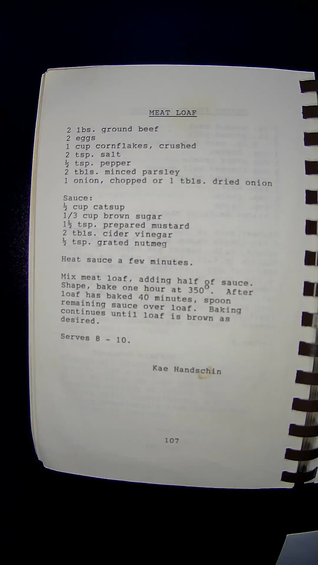 Sure! Here’s the text from the image: --- **MEAT LOAF** - 2 lbs. ground beef - 2 eggs - 1 cup cornflakes, crushed - 2 tsp. salt - ½ tsp. pepper - 2 tbls. minced parsley - 1 onion, chopped or 1 tbls. dried onion **Sauce:** - ½ cup catsup - ⅓ cup brown sugar - 1½ tsp. prepared mustard - 2 tbls. cider vinegar - ½ tsp. grated nutmeg Heat sauce a few minutes. Mix meat loaf, adding half of sauce. Shape, bake one hour at 350°F. After loaf has baked 40 minutes, spoon remaining sauce over loaf. Baking continues until loaf is brown as desired. Serves 8 - 10. *Kae Handschin* 107 --- Let me know if you need anything else!llm
