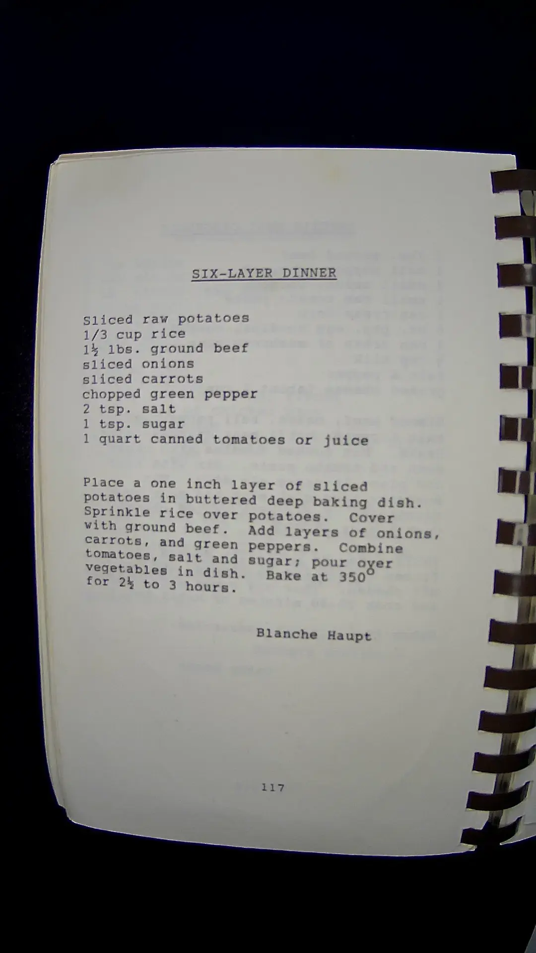 Here’s the text from the image: --- **SIX-LAYER DINNER** - Sliced raw potatoes - 1/3 cup rice - 1½ lbs. ground beef - Sliced onions - Sliced carrots - Chopped green pepper - 2 tbsp. salt - 1 tsp. sugar - 1 quart canned tomatoes or juice Place a one inch layer of sliced potatoes in buttered deep baking dish. Sprinkle rice over potatoes. Cover with ground beef. Add layers of onions, carrots, and green peppers. Combine tomatoes, salt and sugar; pour over vegetables in dish. Bake at 350° for 2½ to 3 hours. Blanche Haupt ---llm