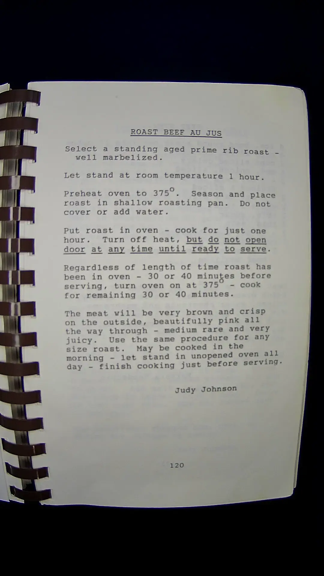 Sure! Here's the text from the image: --- **ROAST BEEF AU JUS** Select a standing aged prime rib roast - well marbelized. Let stand at room temperature 1 hour. Preheat oven to 375°. Season and place roast in shallow roasting pan. Do not cover or add water. Put roast in oven - cook for just one hour. Turn off heat, but do not open door at any time until ready to serve. Regardless of length of time roast has been in oven - 30 or 40 minutes before serving, turn oven on at 375° - cook for remaining 30 or 40 minutes. The meat will be very brown and crisp on the outside, beautifully pink all the way through - medium rare and very juicy. Use the same procedure for any size roast. May be cooked in the morning - let stand in unopened oven all day - finish cooking just before serving. Judy Johnson 120llm