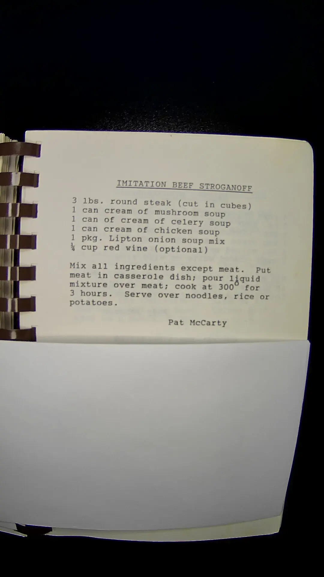 Here is the text from the image: **IMITATION BEEF STROGANOFF** - 3 lbs. round steak (cut in cubes) - 1 can cream of mushroom soup - 1 can of cream of celery soup - 1 can cream of chicken soup - 1 pkg. Lipton onion soup mix - ¼ cup red wine (optional) Mix all ingredients except meat. Put meat in casserole dish; pour liquid mixture over meat; cook at 300°F for 3 hours. Serve over noodles, rice, or potatoes. Pat McCartyllm