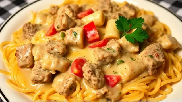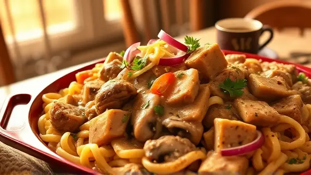 # Pat's Imitation Beef Stroganoff 🍽️🍄 This comforting dish brings the classic flavors of beef stroganoff to your table with an easy twist—using round steak and creamy soups to create a hearty, satisfying meal. Perfect for family dinners or a cozy night in, this recipe blends rich flavors into a delightful sauce that pairs beautifully with noodles, rice, or potatoes. Add a glass of red wine to elevate the experience and enjoy with loved ones! 🍷💖 ## Ingredients ### For the stroganoff - 3 lbs. round steak (cut into cubes) - 1 can cream of mushroom soup - 1 can cream of celery soup - 1 can cream of chicken soup - 1 pkg. Lipton onion soup mix - ¼ cup red wine (optional) ### To serve - Egg noodles, rice, or mashed potatoes ## Instructions - Preheat your oven to 300°F (150°C). - In a bowl, mix together the cream of mushroom soup, cream of celery soup, cream of chicken soup, Lipton onion soup mix, and red wine (if using). > 🥄 Mixing the soups well ensures a uniform flavor and creaminess in the final dish. - Place the cubed round steak in a casserole dish and pour the soup mixture over the top, making sure all the meat is coated. - Cover the casserole dish and bake in the preheated oven for 3 hours. > ⏰ This slow cooking process really tenderizes the meat, allowing the flavors to meld perfectly! - Once ready, serve over your choice of noodles, rice, or creamy mashed potatoes for a complete meal. ## Tips for Perfect Stroganoff - **Quick cooking**: If you're short on time, you can cook this in a slow cooker on low for 6-8 hours or high for 3-4 hours. - **Make it hearty**: Add vegetables like mushrooms, bell peppers, or peas during the last hour of cooking for extra nutrition and flavor. - **Want it thicker?**: If you prefer a thicker sauce, whisk together a tablespoon of cornstarch with a little cold water and stir it into the sauce about 30 minutes before the end of the cooking time. ## Variations - **Mushroom lovers**: Incorporate fresh sautéed mushrooms to enhance the earthy flavor of your stroganoff. 🍄 - **Healthier twist**: Substitute low-fat soups and add fresh herbs like parsley or thyme for a fresher and lighter option. - **Beyond beef**: Use imitation meat products or chicken for a different take on this classic dish. Dig in and enjoy—your friends and family will surely be asking for seconds! 😋name