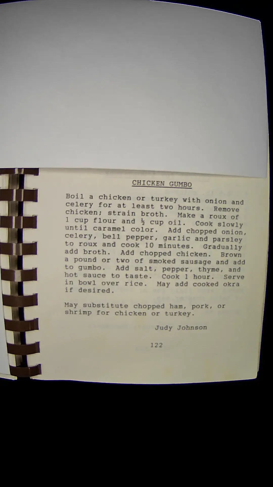Here’s the text from the image you provided: --- **CHICKEN GUMBO** Boil a chicken or turkey with onion and celery for at least two hours. Remove chicken; strain broth. Make a roux of 1 cup flour and ½ cup oil. Cook slowly until caramel color. Add chopped onion, celery, bell pepper, garlic, and parsley to roux and cook 10 minutes. Gradually add broth. Add chopped chicken. Brown a pound or two of smoked sausage and add to gumbo. Add salt, pepper, thyme, and hot sauce to taste. Cook 1 hour. Serve in bowl over rice. May add cooked okra if desired. May substitute chopped ham, pork, or shrimp for chicken or turkey. Judy Johnson 122 --- Let me know if you need anything else!llm