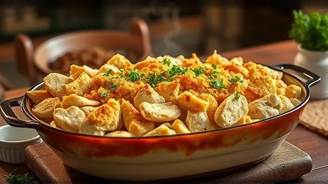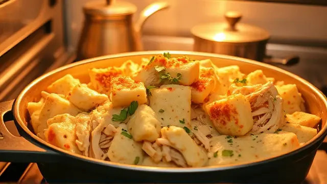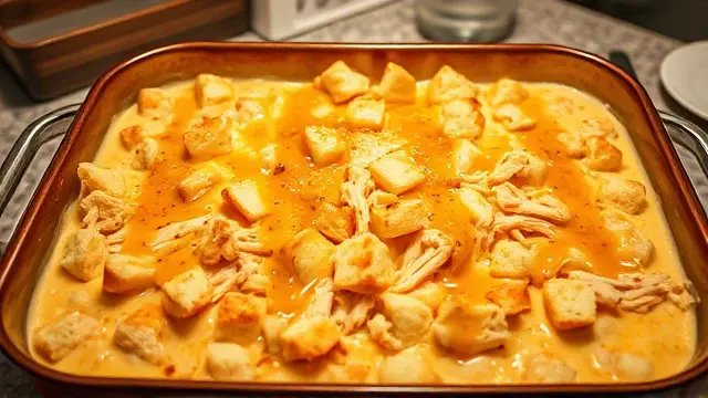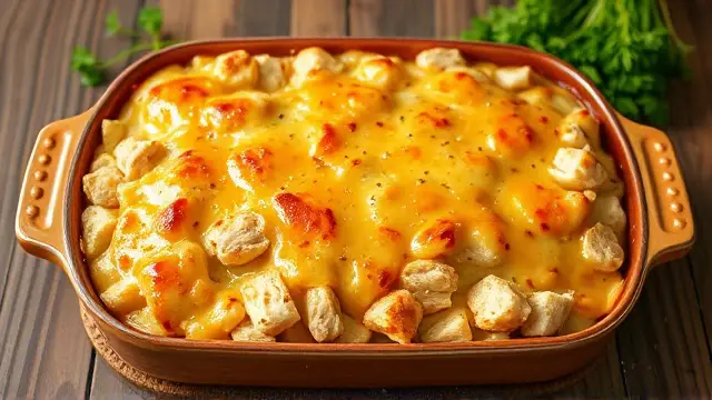 - Bake: Grease a large baking dish (11x13 inches) or two smaller casserole dishes. Pour your chicken mixture into the dish and drizzle the saved broth over the top. Bake in a preheated oven at 350°F (175°C) for 50 minutes, or until the top is golden brown and bubbling.