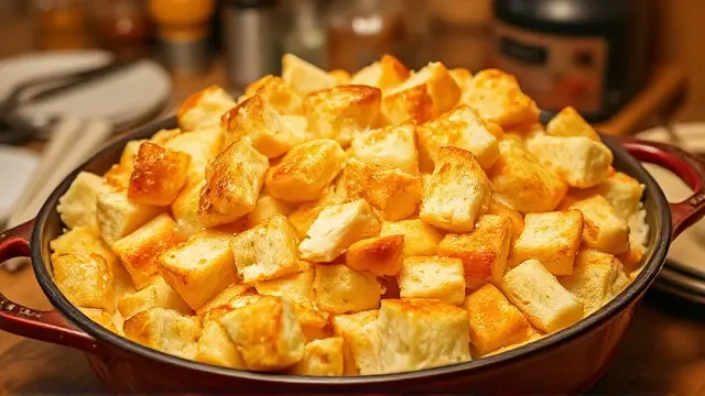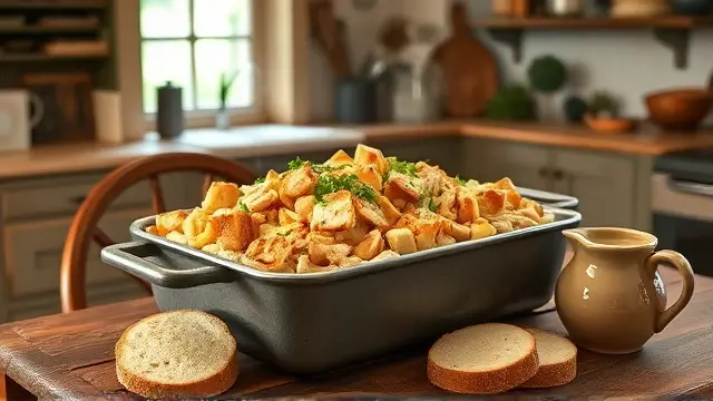 - Prepare the Mixture: In a large mixing bowl, break the bread into small chunks. Add in the shredded chicken, beaten eggs, and the cream of mushroom soup. Mix until well combined.