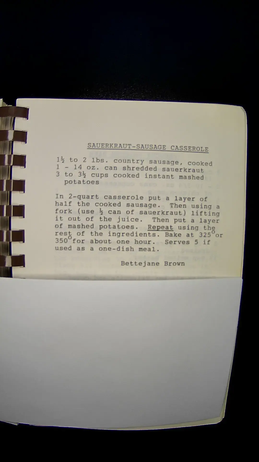 Here’s the text from the image: --- **SAUERKRAUT-SAUSAGE CASSEROLE** 1½ to 2 lbs. country sausage, cooked 1 - 14 oz. can shredded sauerkraut 3 to 3½ cups cooked instant mashed potatoes In 2-quart casserole put a layer of half the cooked sausage. Then using a fork (use ½ can of sauerkraut) lifting it out of the juice. Then put a layer of mashed potatoes. Repeat using the rest of the ingredients. Bake at 325° or 350° for about one hour. Serves 5 if used as a one-dish meal. **Bettejane Brown**llm