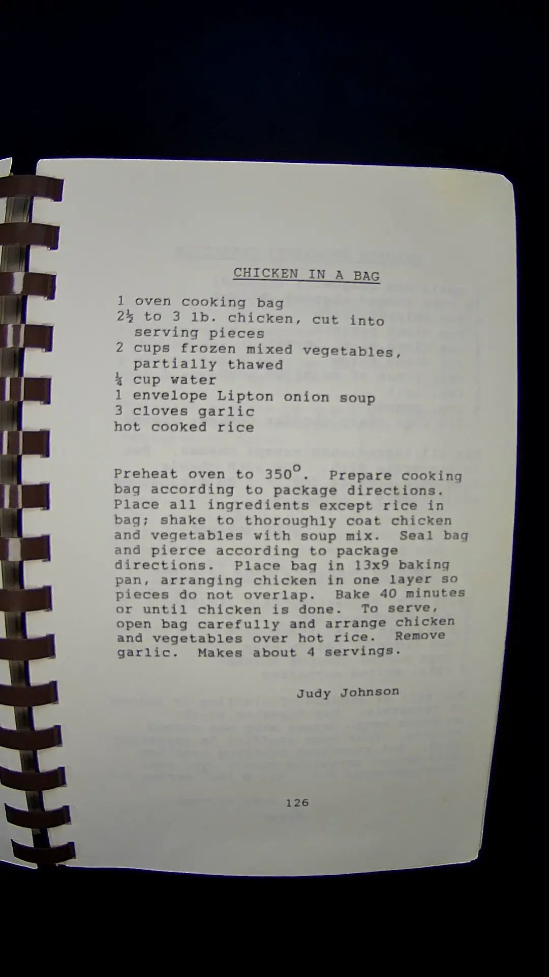 **CHICKEN IN A BAG** 1 oven cooking bag 2½ to 3 lb. chicken, cut into serving pieces 2 cups frozen mixed vegetables, partially thawed ¼ cup water 1 envelope Lipton onion soup 3 cloves garlic hot cooked rice Preheat oven to 350°. Prepare cooking bag according to package directions. Place all ingredients except rice in bag; shake to thoroughly coat chicken and vegetables with soup mix. Seal bag and pierce according to package directions. Place bag in 13x9 baking pan, arranging chicken in one layer so pieces do not overlap. Bake 40 minutes or until chicken is done. To serve, open bag carefully and arrange chicken and vegetables over hot rice. Remove garlic. Makes about 4 servings. Judy Johnson 126llm