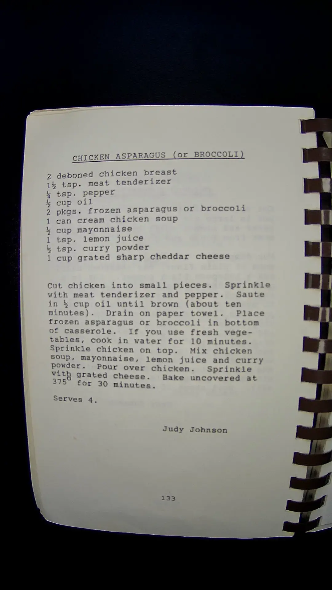 Here’s the text from the image: --- **CHICKEN ASPARAGUS (or BROCCOLI)** 2 deboned chicken breast 1½ tsp. meat tenderizer 1½ tsp. pepper ½ cup oil 2 pkgs. frozen asparagus or broccoli 1 can cream chicken soup ½ cup mayonnaise 1 tbsp. lemon juice ½ tsp. curry powder 1 cup grated sharp cheddar cheese Cut chicken into small pieces. Sprinkle with meat tenderizer and pepper. Sauté in ½ cup oil until brown (about ten minutes). Drain on paper towel. Place frozen asparagus or broccoli in bottom of casserole. If you use fresh vegetables, cook in water for 10 minutes. Sprinkle chicken on top. Mix chicken soup, mayonnaise, lemon juice, and curry powder. Pour over chicken. Sprinkle with grated cheese. Bake uncovered at 375 for 30 minutes. Serves 4. Judy Johnson --- If you need anything else, feel free to ask!llm