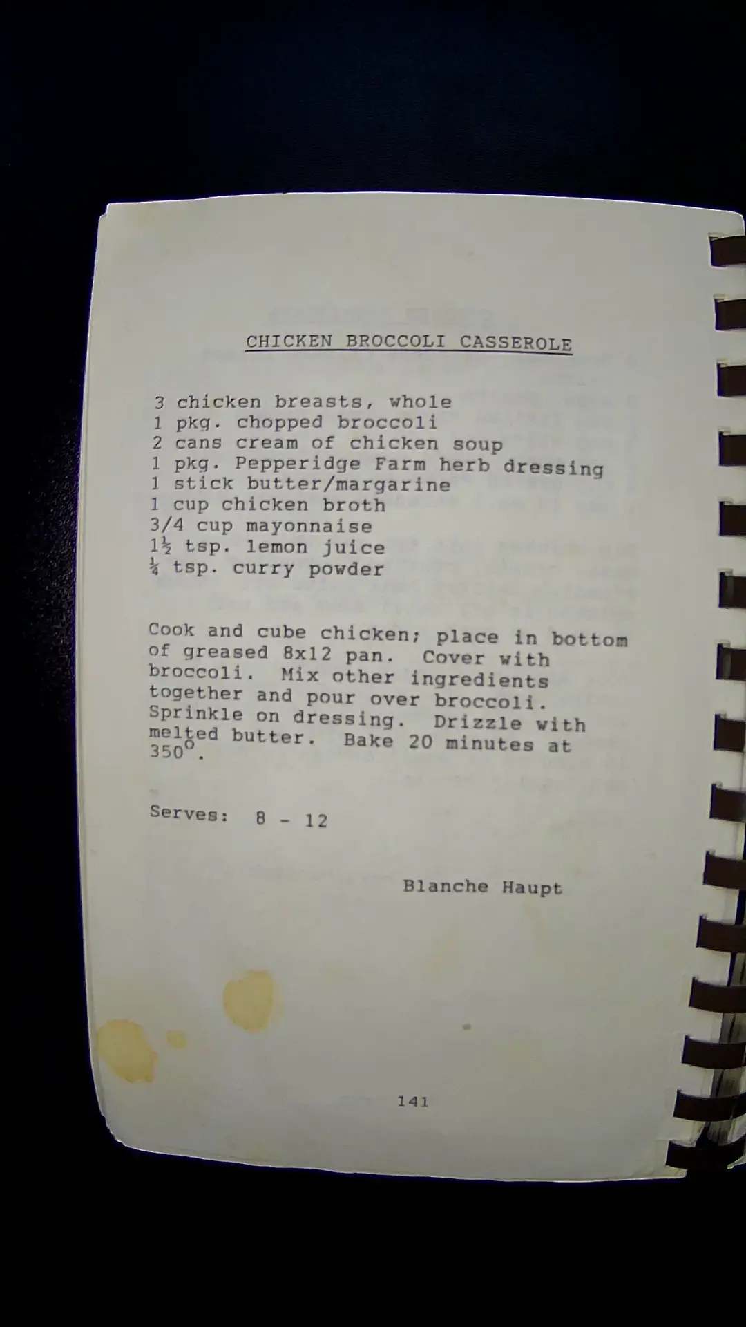 Here's the text from the image: **CHICKEN BROCCOLI CASSEROLE** - 3 chicken breasts, whole - 1 pkg. chopped broccoli - 2 cans cream of chicken soup - 1 pkg. Pepperidge Farm herb dressing - 1 stick butter/margarine - 1 cup chicken broth - 3/4 cup mayonnaise - 1 1/2 tsp. lemon juice - 3/4 tsp. curry powder **Instructions:** Cook and cube chicken; place in bottom of greased 8x12 pan. Cover with broccoli. Mix other ingredients together and pour over broccoli. Sprinkle on dressing. Drizzle with melted butter. Bake 20 minutes at 350°F. **Serves:** 8 - 12 **Blanche Haupt** **141**llm