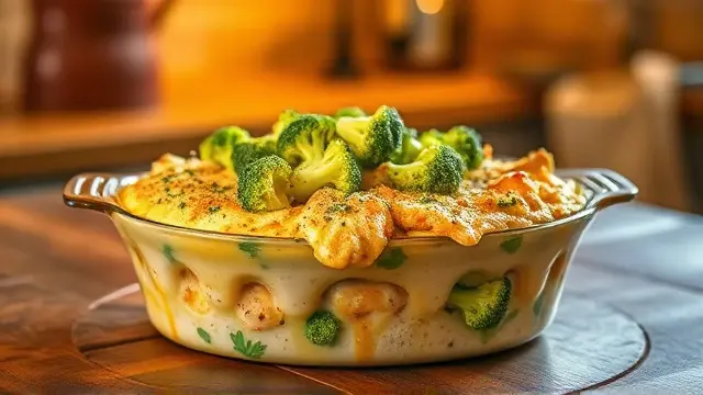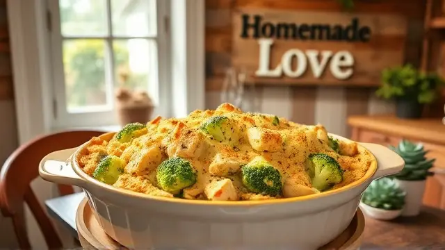 # Blanche's Comforting Chicken Broccoli Casserole 🍗🥦 This hearty Chicken Broccoli Casserole is a warm and inviting dish that's sure to become a family favorite. The tender chunks of chicken meld beautifully with creamy broccoli and a savory dressing, creating a satisfying meal in one bake. Perfect for cozy dinners or potlucks, this dish is both easy to prepare and incredibly delicious! ## Ingredients ### Main Ingredients - **3 whole chicken breasts**, cooked and cubed - **1 package of frozen chopped broccoli** (thawed) - **2 cans of cream of chicken soup** - **1 package of Pepperidge Farm herb stuffing** - **1 stick of butter/margarine** (melted) - **1 cup of chicken broth** - **3/4 cup of mayonnaise** - **1 1/2 teaspoons of lemon juice** - **3/4 teaspoon of curry powder** (optional, but recommended for a flavor kick!) ## Instructions 1. **Prepare the Chicken**: Cook the chicken breasts thoroughly, then cube them into bite-sized pieces. Place the cubed chicken at the bottom of a greased 8x12-inch baking pan. 2. **Layer the Broccoli**: Evenly distribute the thawed broccoli over the chicken layer. 3. **Mix the Sauce**: In a separate bowl, combine the cream of chicken soup, chicken broth, mayonnaise, lemon juice, and curry powder. Mix well until smooth. 4. **Combine**: Pour the creamy mixture over the broccoli, ensuring an even coat. 5. **Top with Dressing**: Sprinkle the Pepperidge Farm herb stuffing evenly over the casserole. Drizzle the melted butter over the top. 6. **Bake**: Place in a preheated oven at 350°F (180°C) and bake for 20 minutes or until bubbly and golden brown on top. 7. **Serve and Enjoy**: Let it cool for a few minutes before serving. This casserole can easily serve 8 to 12 people! > 🍽️ Pro Tip: This casserole reheats wonderfully, making it a great option for meal prep! Just store leftovers in an airtight container in the fridge and reheat when needed. ## Customization Ideas - **Vegetable Add-ins**: Feel free to add other veggies like carrots, peas, or bell peppers to the casserole for extra nutrition and flavor. Just adjust the sauce quantity if needed! - **Cheesy Delight**: Add some shredded cheese—like cheddar or mozzarella—on top of the dressing for an extra gooey finish. Just remember to increase the baking time slightly if the cheese doesn't melt right away. 🧀 - **Low-Carb Option**: Replace the stuffing with a mixture of crushed pork rinds or omit it entirely for a low-carb version! Whip up this delicious Chicken Broccoli Casserole for your next meal, and watch as it disappears before your eyes! Enjoy! 🍽️❤️name