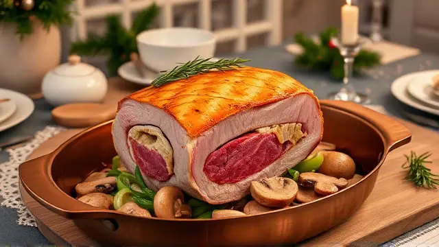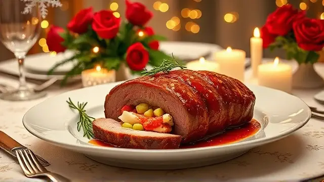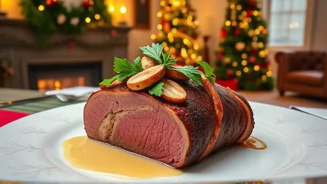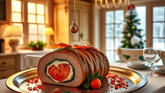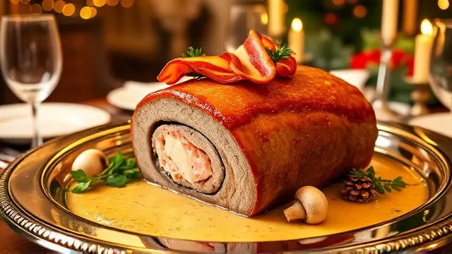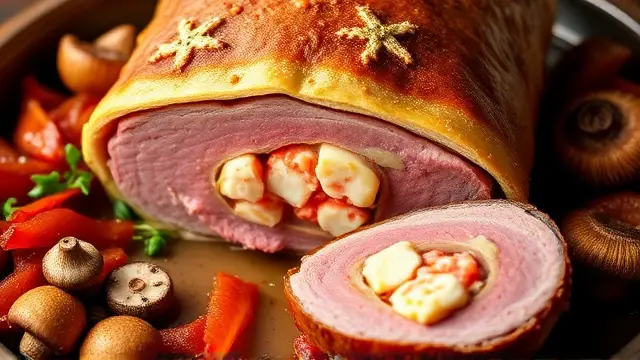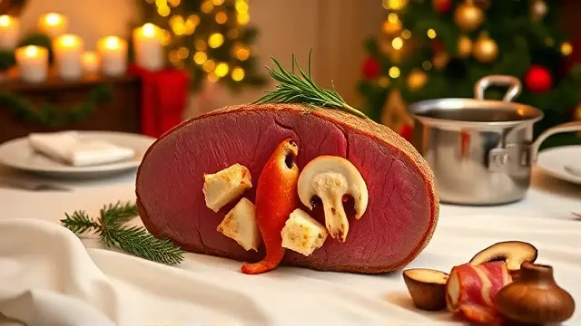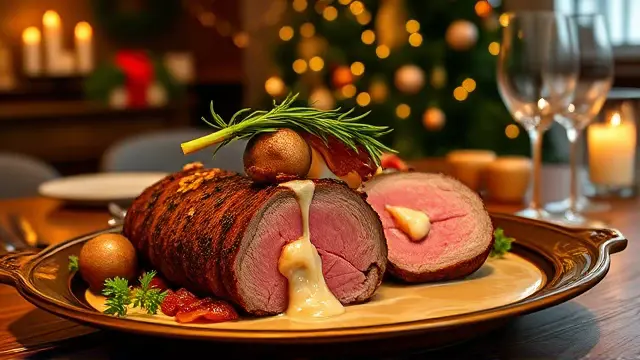 **Christmas Lobster Stuffed Tenderloin of Beef** ======================= If you're looking for a show-stopping main course that will impress your holiday guests, look no further! This recipe is a masterclass in luxurious flavors and textures, all wrapped up in a perfectly cooked tenderloin of beef. The combination of succulent lobster meat, crispy bacon, and rich white wine sauce is sure to wow even the most discerning palates. Don't be intimidated by the multi-step process - trust us, it's worth the extra effort! **Ingredients** --------------- * 1 (3-4 pound) whole beef tenderloin * 2-4 ounces frozen lobster tails ( thawed) * 1 tablespoon melted butter * 1.5 teaspoons lemon juice * 6 slices of bacon (partially cooked) * 1/2 cup sliced green onion * 1/2 cup dry white wine * Salt and pepper to taste **Directions** ------------- ### Stuffing the Tenderloin 1. Butterfly the beef by slicing lengthwise, careful not to cut all the way through. 2. Place one of the lobster tails inside the beef and close the meat around it. Repeat with the remaining lobster tail (if using). 3. Drizzle the melted butter over the lobster and sprinkle with lemon juice. ### Creating the Wine Sauce 1. In a saucepan, cook the sliced green onions in the remaining 1/2 cup of butter until tender, stirring frequently. 2. Add the white wine to the saucepan and stir through. 3. Remove from heat and add garlic salt (optional). ### Assembling and Serving 1. Lay the partially cooked bacon slices on top of the stuffed beef. 2. Place the tenderloin in a roasting pan set over low heat. 3. Roast for 45 minutes, then increase the oven temperature to broil and brown the bacon for an additional 5 minutes. 4. To serve, slice the roast against the grain and spoon the white wine sauce over the top. 5. Garnish with fluted whole mushrooms and watercress. **Variations and Adjustments** Feel free to get creative with this recipe! Some potential variations include: * Using a combination of lobster and crab meat for an added layer of flavor * Adding some diced chives or scallions to the white wine sauce * Experimenting with different types of cheese (such as Brie or Parmesan) to add an extra layer of richnessname