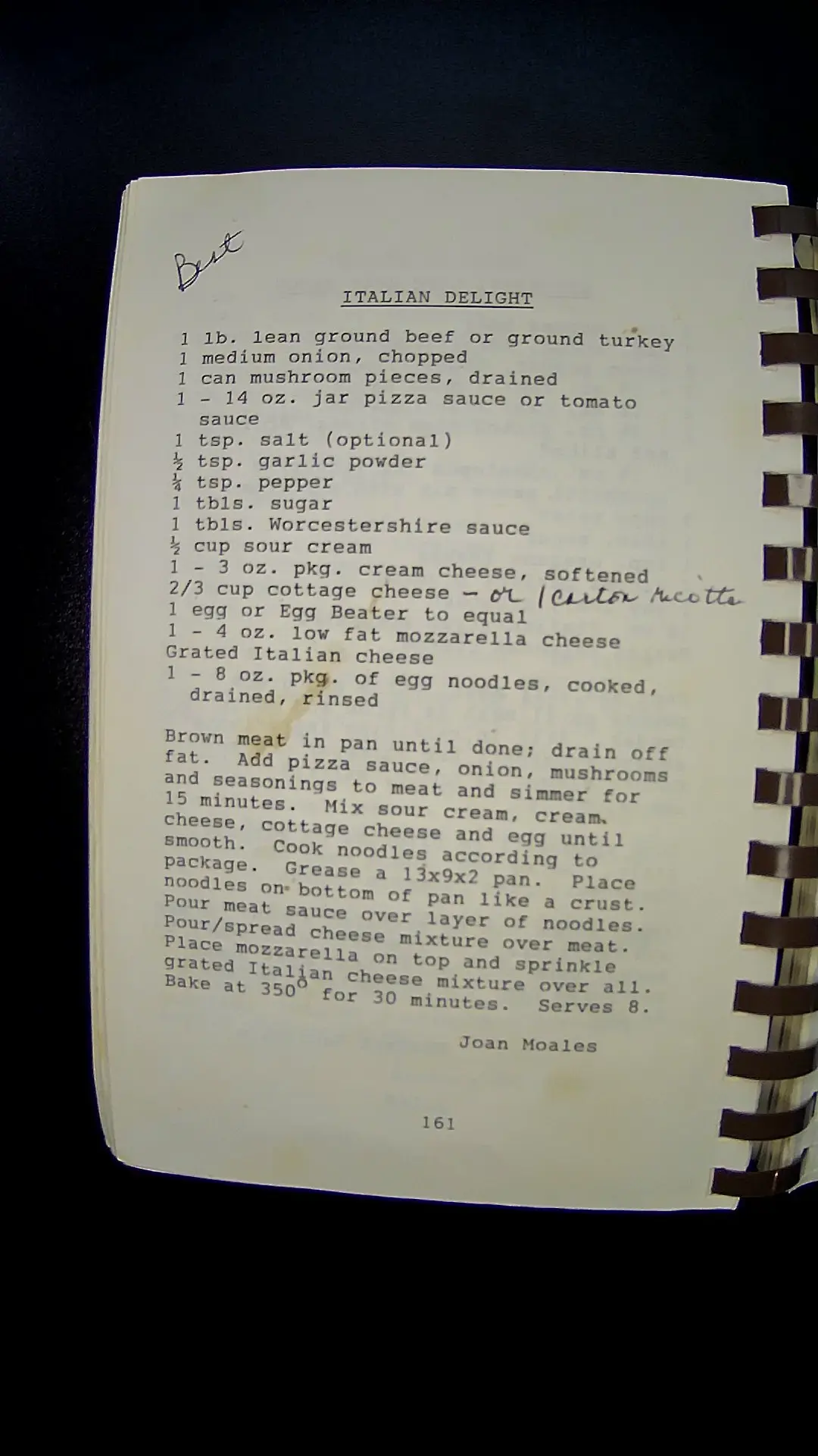 Here’s the text from the image: --- **ITALIAN DELIGHT** 1 lb. lean ground beef or ground turkey 1 medium onion, chopped 1 can mushroom pieces, drained 1 - 14 oz. jar pizza sauce or tomato sauce 1 tsp. salt (optional) ½ tsp. garlic powder ¾ tsp. pepper 1 tbls. sugar 1 tbls. Worcestershire sauce ½ cup sour cream 1 - 3 oz. pkg. cream cheese, softened 2/3 cup cottage cheese - or ricotta 1 egg or Egg Beater to equal 1 - 4 oz. low fat mozzarella cheese Grated Italian cheese 1 - 8 oz. pkg. of egg noodles, cooked, drained, rinsed Brown meat in pan until done; drain off fat. Add pizza sauce, onion, mushrooms and seasonings to meat and simmer for 15 minutes. Mix sour cream, cream cheese, cottage cheese and egg until smooth. Cook noodles according to package. Grease a 13x9x2 pan. Place noodles on bottom of pan like a crust. Pour/spread meat sauce over layer of noodles. Place cheese mixture over meat. Place mozzarella on top and sprinkle grated Italian cheese mixture over all. Bake at 350° for 30 minutes. Serves 8. Joan Moales 161 --- If you need any help with this recipe, let me know!llm