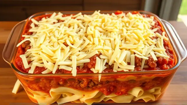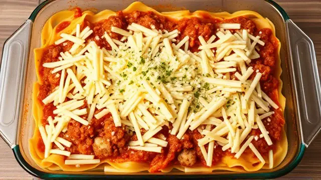 - Pour the meat sauce over the noodle layer, spreading it evenly.