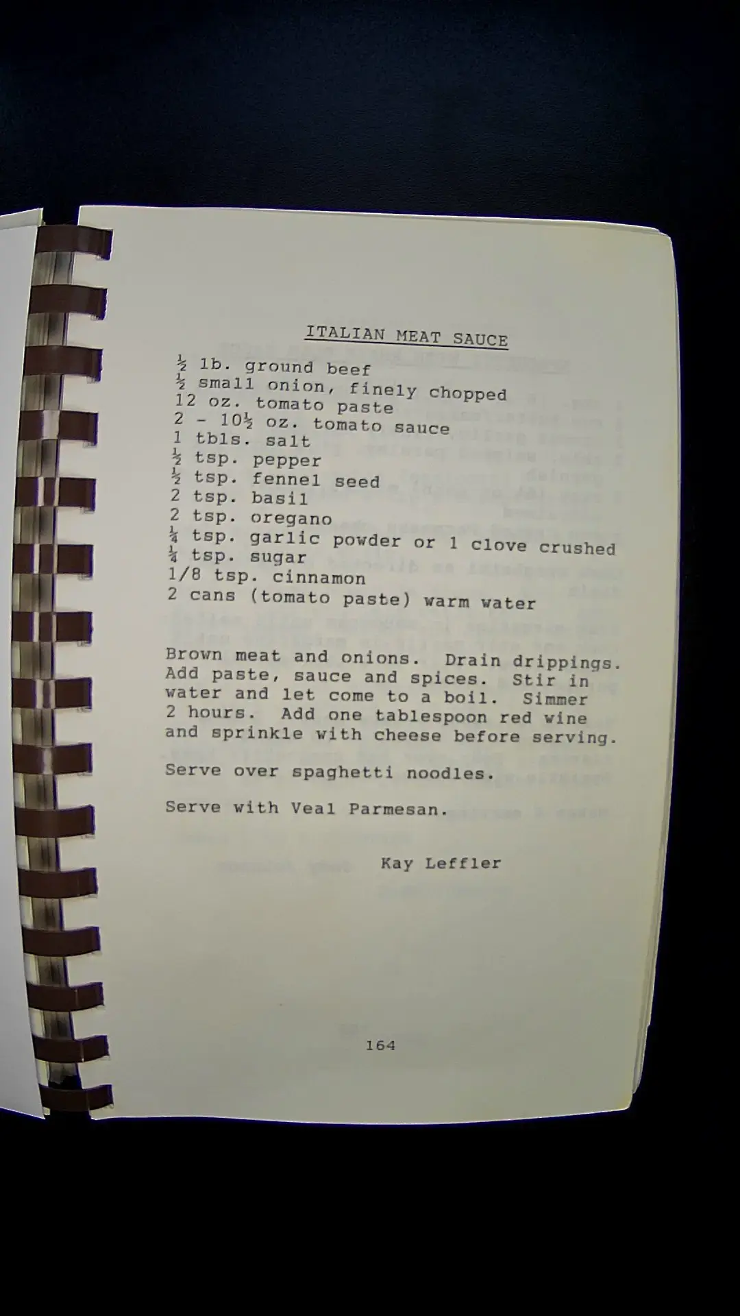 Here is the text from the image: **ITALIAN MEAT SAUCE** - ½ lb. ground beef - ½ small onion, finely chopped - 12 oz. tomato paste - 2 - 10½ oz. tomato sauce - 1 tbls. salt - ½ tsp. pepper - ½ tsp. fennel seed - 2 tsp. basil - 2 tsp. oregano - ¼ tsp. garlic powder or 1 clove crushed - ¼ tsp. sugar - 1/8 tsp. cinnamon - 2 cans (tomato paste) warm water **Instructions:** Brown meat and onions. Drain drippings. Add paste, sauce, and spices. Stir in water and let come to a boil. Simmer for 2 hours. Add one tablespoon red wine and sprinkle with cheese before serving. Serve over spaghetti noodles. Serve with Veal Parmesan. Kay Leffler 164llm