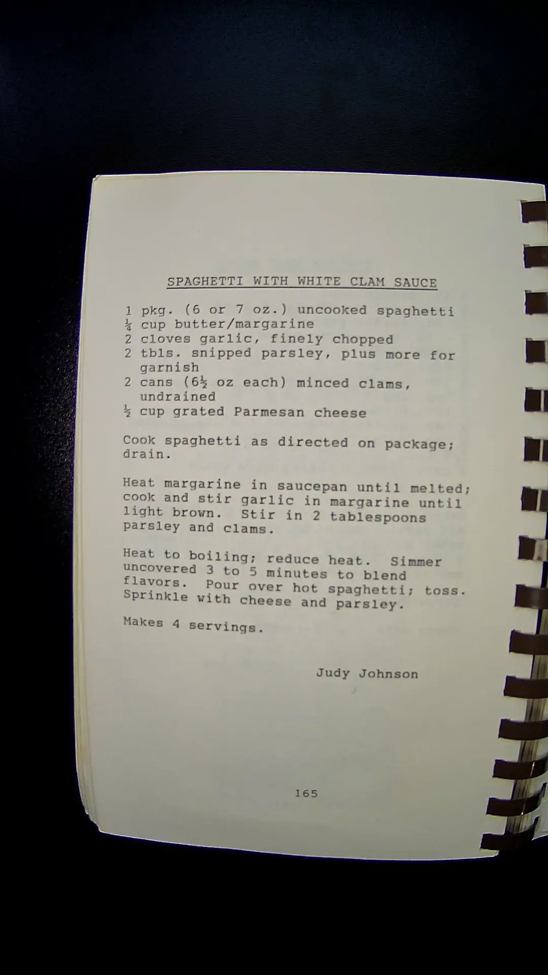 Here's the text from the image: **SPAGHETTI WITH WHITE CLAM SAUCE** 1 pkg. (6 or 7 oz.) uncooked spaghetti ½ cup butter/margarine 2 cloves garlic, finely chopped 2 tbls. snipped parsley, plus more for garnish 2 cans (6½ oz each) minced clams, undrained ½ cup grated Parmesan cheese Cook spaghetti as directed on package; drain. Heat margarine in saucepan until melted; cook and stir garlic in margarine until light brown. Stir in 2 tablespoons parsley and clams. Heat to boiling; reduce heat. Simmer uncovered 3 to 5 minutes to blend flavors. Pour over hot spaghetti; toss. Sprinkle with cheese and parsley. Makes 4 servings. Judy Johnson 165llm