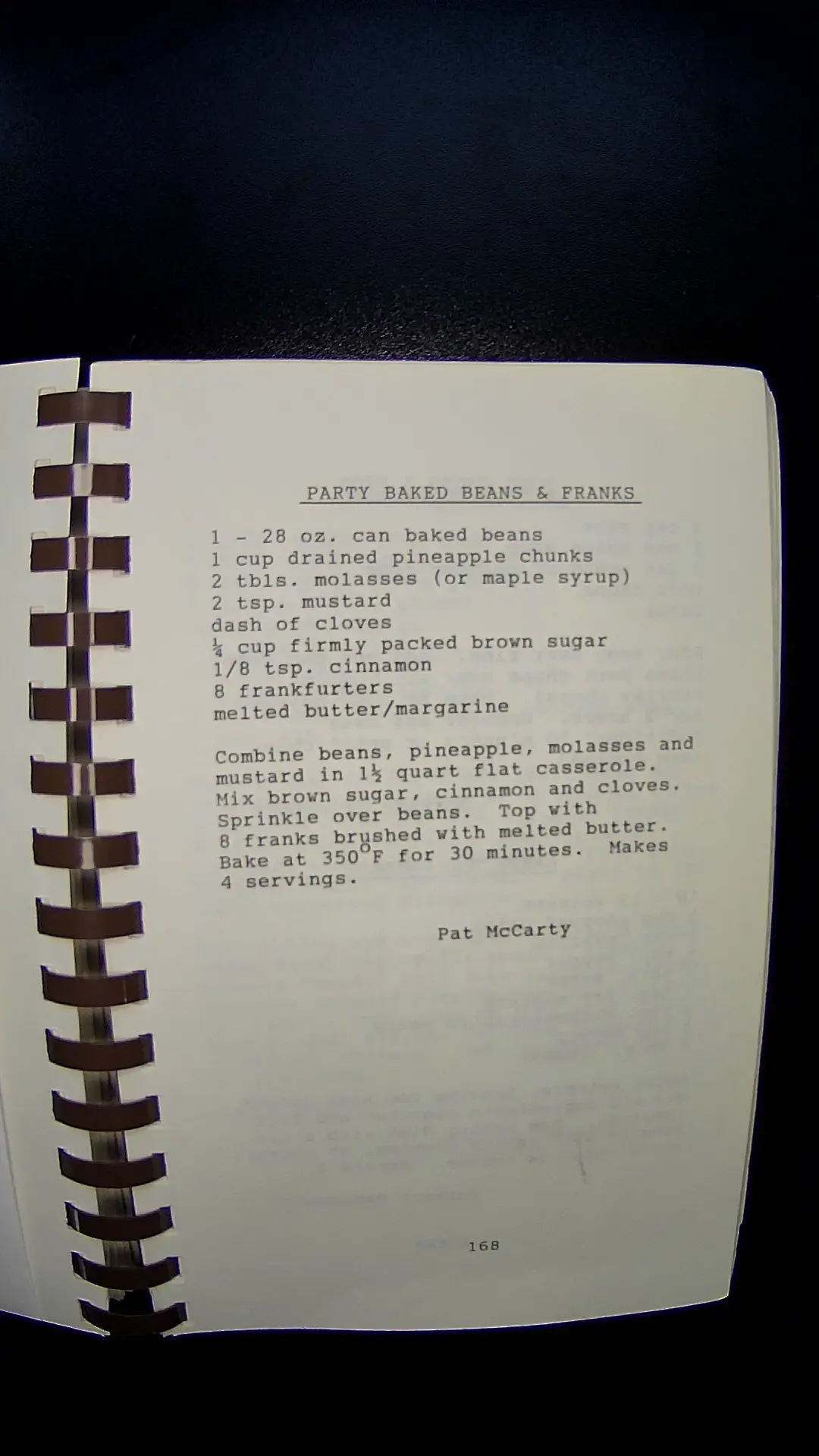 Here’s the text from the image: --- **PARTY BAKED BEANS & FRANKS** 1 - 28 oz. can baked beans 1 cup drained pineapple chunks 2 tbls. molasses (or maple syrup) 2 tsp. mustard dash of cloves ¼ cup firmly packed brown sugar 1/8 tsp. cinnamon 8 frankfurters melted butter/margarine Combine beans, pineapple, molasses and mustard in 1½ quart flat casserole. Mix brown sugar, cinnamon and cloves. Sprinkle over beans. Top with 8 frankfurters brushed with melted butter. Bake at 350°F for 30 minutes. Makes 4 servings. Pat McCarty --- Feel free to ask if you need anything else!llm