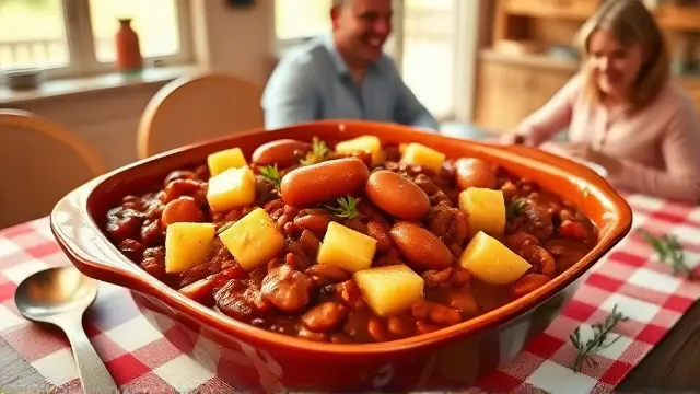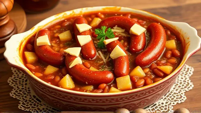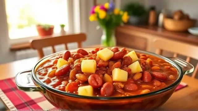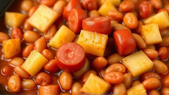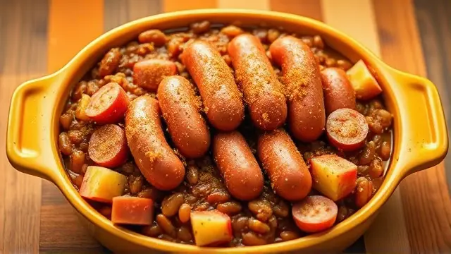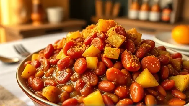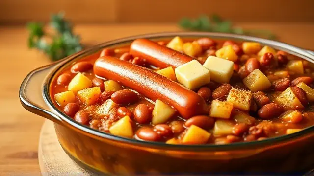 # Pat's Party Baked Beans & Franks 🍽️🌭 Get ready to wow your guests with this delightful and hearty dish that’s perfect for parties, picnics, or cozy family dinners! Pat's Party Baked Beans & Franks is a crowd-pleaser combining sweet and savory flavors that will have everyone coming back for seconds. This recipe is not only quick to make but also super customizable to suit your taste. You can easily turn up the flavor profile by adding spices or tweaking the toppings! ### Pair it with: A side of cornbread and a fresh green salad for a full meal experience. Don't forget the drinks—ice-cold lemonade or a frosty beer will complement this dish beautifully! 🍋🍺 ## Ingredients ### Main Ingredients - 1 (28 oz.) can baked beans - 1 cup drained pineapple chunks - 2 tablespoons molasses (or maple syrup) - 2 teaspoons mustard - Dash of cloves ### Flavor Boosters - ¼ cup firmly packed brown sugar - ⅛ teaspoon cinnamon - 8 frankfurters - Melted butter or margarine for brushing ## Instructions 1. Preheat your oven to 350°F (175°C). 2. In a 1½ quart flat casserole dish, combine the baked beans, pineapple chunks, molasses, and mustard. Stir well to mix those flavors! > 🔄 **Tip**: For an extra pop of flavor, try using spicy mustard or adding a pinch of cayenne pepper! 3. In a separate bowl, mix together the brown sugar, cinnamon, and cloves. Sprinkle this sweet-spicy mix over the bean mixture. > ✨ The balance of sweetness and spices makes this dish irresistible! 4. Top the bean mixture with frankfurters that have been brushed with melted butter. 5. Bake in the preheated oven for 30 minutes, until bubbly and golden. > 🍽️ **Serving Suggestion**: Using mini frankfurters makes it easier for guests to serve themselves and adds a fun twist! ### Variations - **Vegetarian**: Swap out the frankfurters for sliced veggie sausages. - **Fiery Kick**: Add diced jalapeños or a splash of hot sauce for a spicy twist. - **Smoky Flavor**: Mix in some smoked paprika to enhance the depth of flavors. - **Sweetness**: If you love sweet beans, add more pineapple or a bit of brown sugar! ### Storage Tips - Leftovers can be stored in an airtight container in the refrigerator for up to 3 days. They reheat well in the microwave or on the stovetop! Enjoy this delicious dish that’s sure to be the star of your next gathering! 🌟name