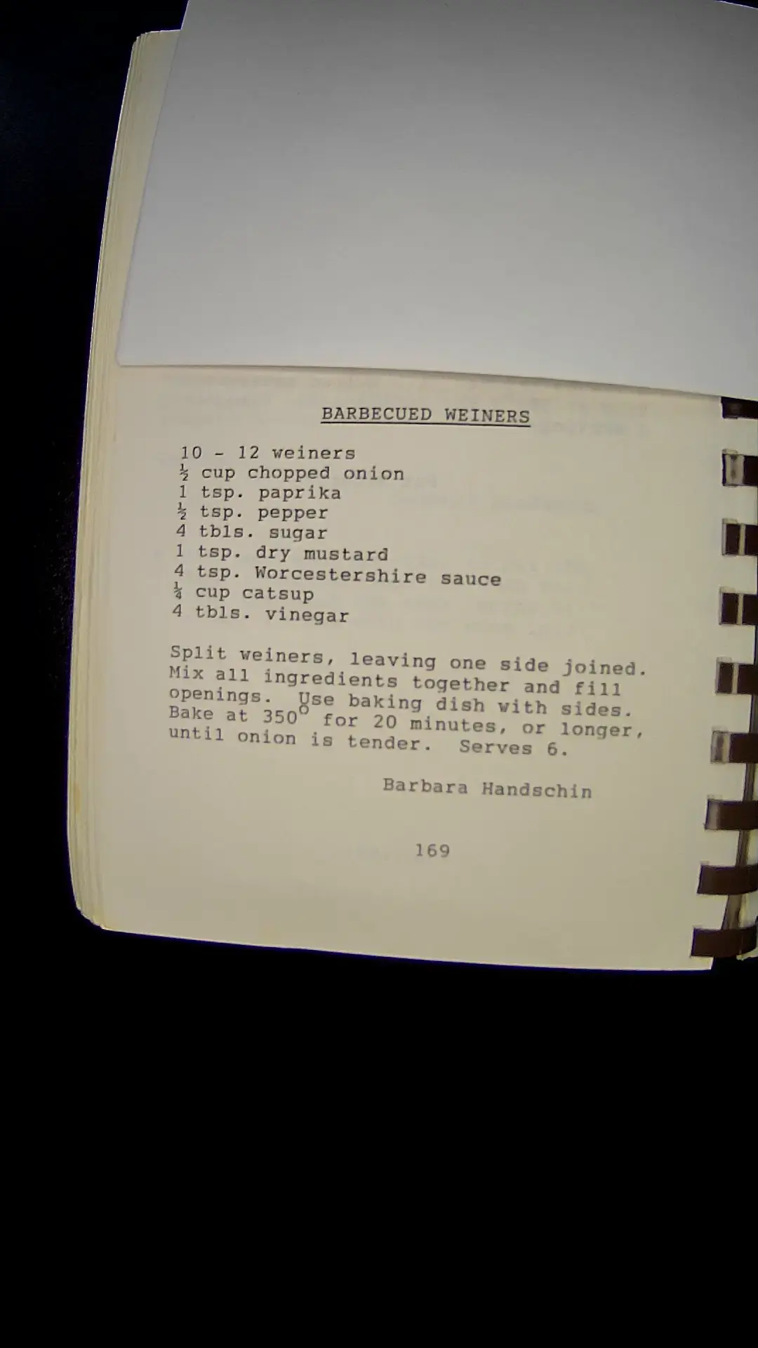 Here’s the text from the image: **BARBECUED WEINERS** 10 - 12 weiners ½ cup chopped onion 1 tsp. paprika ½ tsp. pepper 4 tbls. sugar 1 tsp. dry mustard 4 tsp. Worcestershire sauce ¾ cup catsup 4 tbls. vinegar Split weiners, leaving one side joined. Mix all ingredients together and fill openings. Use baking dish with sides. Bake at 350°F for 20 minutes, or longer, until onion is tender. Serves 6. Barbara Handschin 169llm