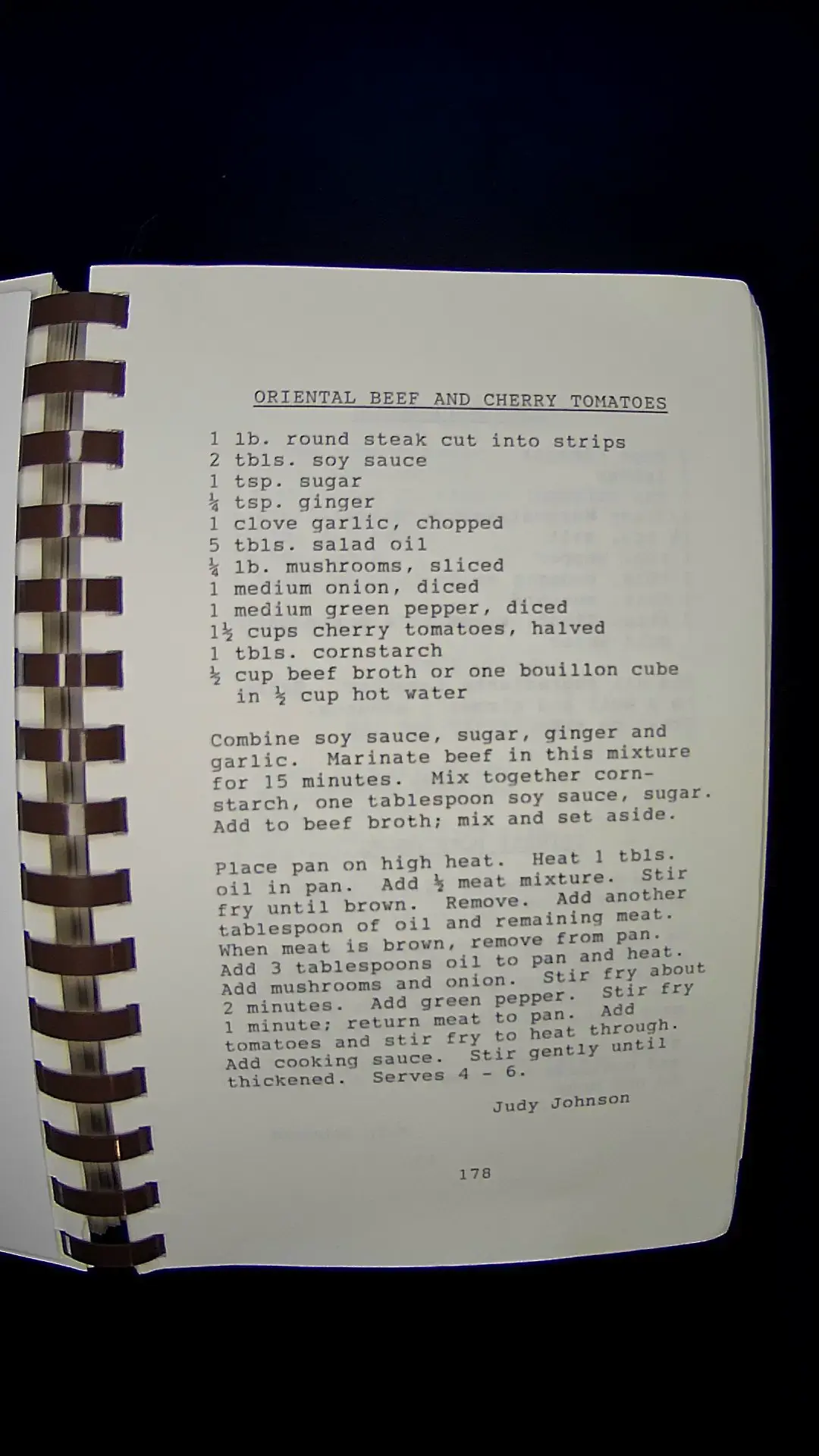 Here's the text from the image: --- **ORIENTAL BEEF AND CHERRY TOMATOES** 1 lb. round steak cut into strips 2 tbls. soy sauce 1 tsp. sugar ¼ tsp. ginger 1 clove garlic, chopped 5 tbls. salad oil ¼ lb. mushrooms, sliced 1 medium onion, diced 1 medium green pepper, diced 1½ cups cherry tomatoes, halved 1 tbls. cornstarch ½ cup beef broth or one bouillon cube in ½ cup hot water Combine soy sauce, sugar, ginger and garlic. Marinate beef in this mixture for 15 minutes. Mix together cornstarch, one tablespoon soy sauce, sugar. Add to beef broth; mix and set aside. Place pan on high heat. Heat 1 tbls. oil in pan. Add ½ meat mixture. Stir fry until brown. Remove. Add another tablespoon of oil and remaining meat. When meat is brown, remove from pan. Add 3 tablespoons oil to pan and heat. Add mushrooms and onion. Stir fry about 2 minutes. Add green pepper. Stir fry 1 minute; return meat to pan. Add tomatoes and stir fry to heat through. Add cooking sauce. Stir gently until thickened. Serves 4 - 6. Judy Johnson 178 --- Let me know if you need anything else!llm