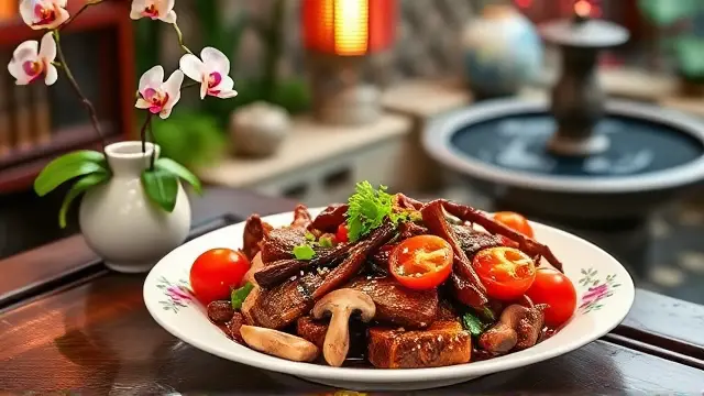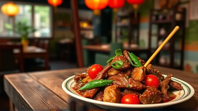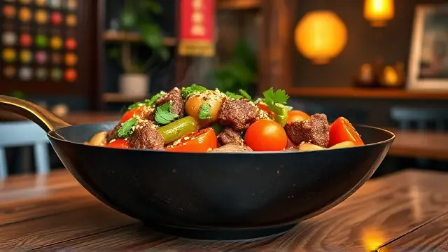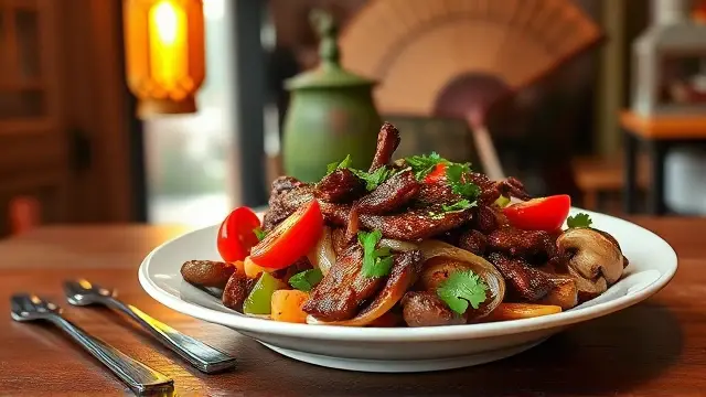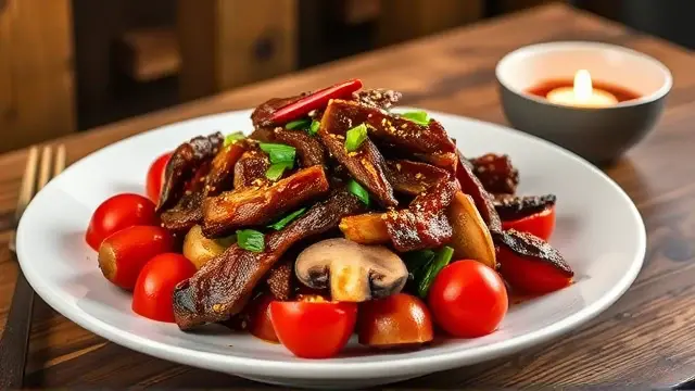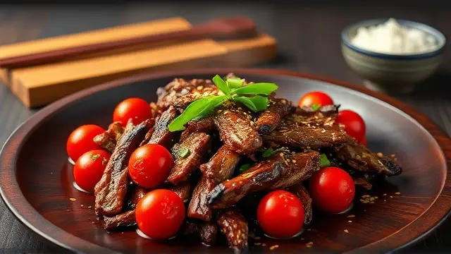 # Judy's Flavorful Oriental Beef with Cherry Tomatoes 🍅🥢 This vibrant dish combines tender beef strips with the freshness of cherry tomatoes and sautéed vegetables, all bathed in a savory oriental sauce. Perfect for a weeknight dinner or a special gathering, it's both quick to prepare and packed with flavor. Serve it over cooked rice or noodles for a complete meal that will impress family and friends! 🍚✨ ## Ingredients ### For the Beef Marinade - 1 lb round steak, cut into strips - 2 tablespoons soy sauce - 1 teaspoon sugar - ¼ teaspoon ground ginger - 1 clove garlic, chopped ### For the Stir-Fry - 5 tablespoons salad oil (divided) - ¼ lb mushrooms, sliced - 1 medium onion, diced - 1 medium green pepper, diced - 1½ cups cherry tomatoes, halved - 1 tablespoon cornstarch - ½ cup beef broth (or 1 bouillon cube dissolved in ½ cup hot water) ## Instructions 1. **Marinate the Beef**: In a medium bowl, combine soy sauce, sugar, ginger, and garlic. Add the beef strips and let them marinate for 15 minutes while you prepare the other ingredients. > 🍖 For extra flavor, consider marinating the beef for longer if you have time. It can soak up more of the sauce! 2. **Prepare the Sauce**: In a separate bowl, mix together the cornstarch, 1 tablespoon soy sauce, and sugar. Combine this mixture with the beef broth, and set aside. 3. **Stir-Fry the Beef**: Heat 1 tablespoon of oil in a large pan over high heat. Add half of the marinated beef and stir-fry until browned. Remove the browned beef and set aside. Repeat with another tablespoon of oil and the remaining beef. 4. **Cook the Vegetables**: In the same pan, add 3 tablespoons of oil and heat. Add the mushrooms and diced onion, stir-frying for about 2 minutes. Then add the diced green pepper and stir-fry for another minute. 5. **Combine Everything**: Return the cooked beef to the pan along with the halved cherry tomatoes. Stir-fry everything together to heat through. Finally, pour in the prepared cooking sauce, mixing gently until the sauce thickens. 6. **Serve**: Serve hot, and enjoy with rice or noodles! > 🌟 This dish is best enjoyed fresh. If you have leftovers, they can be stored in the fridge for up to 2 days and reheated gently. ## Variations - **Vegetarian Twist**: Substitute beef with tofu or tempeh for a hearty vegetarian option. Use vegetable broth instead of beef broth for extra flavor. - **Add More Veggies**: Feel free to add other vegetables like snap peas, broccoli, or carrots for a colorful, nutrient-packed stir-fry. - **Spicy Kick**: If you love heat, add some red pepper flakes or a splash of sriracha to the marinade. Enjoy this delightful Oriental Beef and Cherry Tomatoes dish, and don't forget to share your version with family and friends! 🌈🍽️name