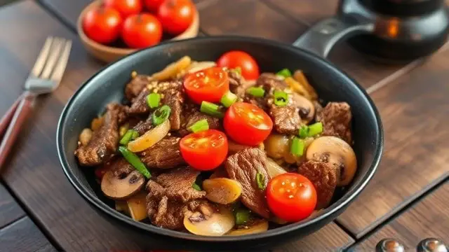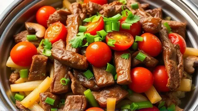 This vibrant dish combines tender beef strips with the freshness of cherry tomatoes and sautéed vegetables, all bathed in a savory oriental sauce. Perfect for a weeknight dinner or a special gathering, it's both quick to prepare and packed with flavor. Serve it over cooked rice or noodles for a complete meal that will impress family and friends! 🍚✨