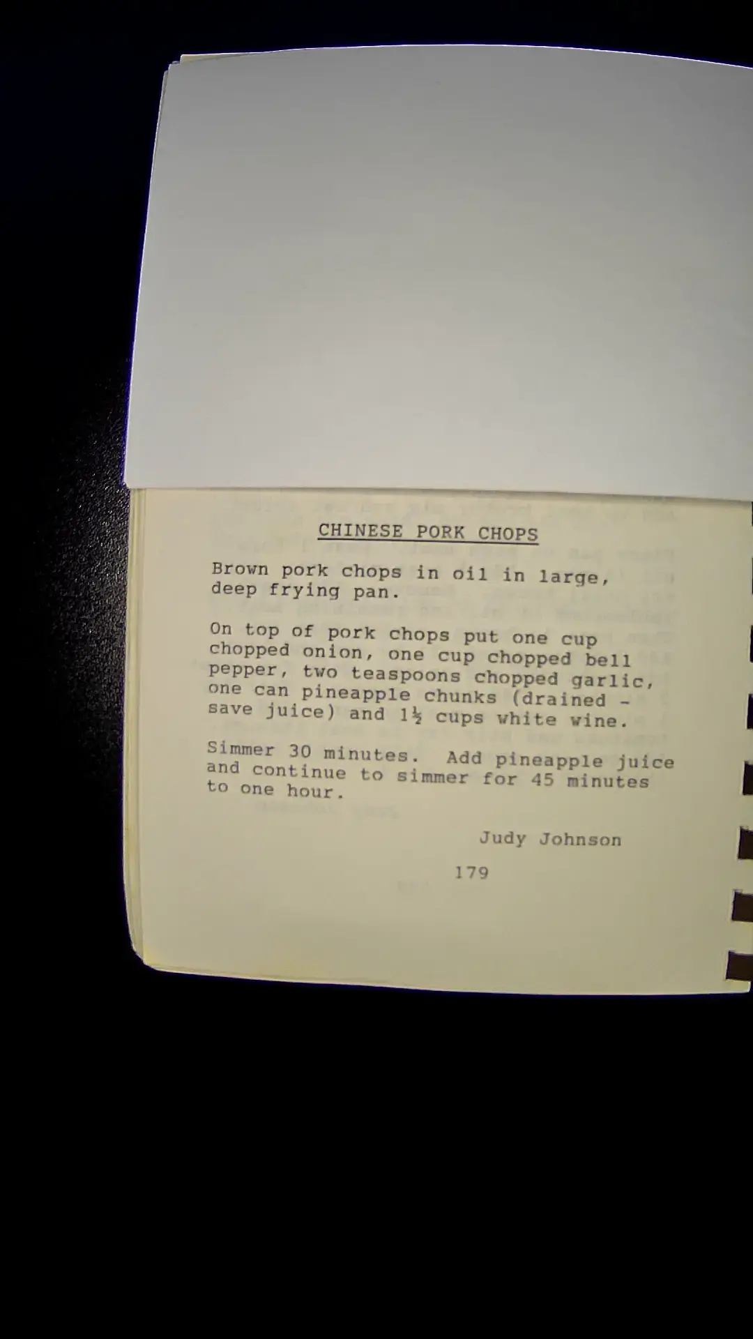 Here is the text from the image: **CHINESE PORK CHOPS** Brown pork chops in oil in large, deep frying pan. On top of pork chops put one cup chopped onion, one cup chopped bell pepper, two teaspoons chopped garlic, one can pineapple chunks (drained - save juice) and 1½ cups white wine. Simmer 30 minutes. Add pineapple juice and continue to simmer for 45 minutes to one hour. Judy Johnson 179llm