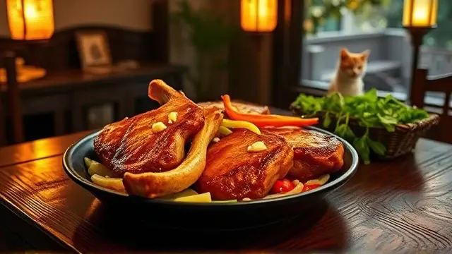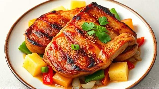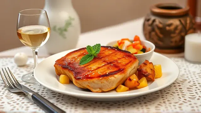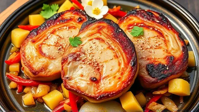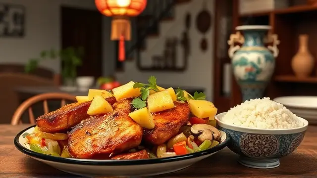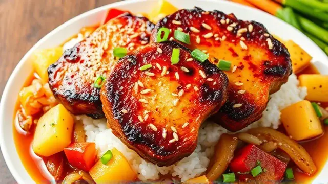 # Judy's Savory Chinese Pork Chops 🐖🍍 This delightful recipe for Chinese Pork Chops brings a burst of flavor to your dinner table! The combination of tender pork, sweet pineapple, and fragrant vegetables creates a mouthwatering dish that's perfect for family gatherings or a cozy dinner at home. Pair it with steamed rice to soak up the delicious sauce—your taste buds will thank you! 🍚✨ ## Ingredients ### For the Pork Chops - 4 pork chops (bone-in or boneless) - 2 tablespoons vegetable oil ### For the Sauce - 1 cup chopped onion - 1 cup chopped bell pepper (any color) - 2 teaspoons minced garlic - 1 can pineapple chunks (drained, but save the juice) - 1½ cups white wine ## Instructions 1. **Heat the Oil**: In a large, deep frying pan, heat the vegetable oil over medium-high heat. 2. **Brown the Pork Chops**: Add the pork chops to the pan and brown them on both sides for about 3-4 minutes. > 🔥 Ensure the pan is hot enough before adding the pork to achieve a lovely sear. This will enhance the flavor and keep the juices locked in! 3. **Add the Vegetables and Pineapple**: Layer the chopped onion, bell pepper, minced garlic, and pineapple chunks on top of the pork chops. 4. **Pour the Wine**: Add the white wine to the pan. 5. **Simmer**: Cover the pan and simmer for 30 minutes. 6. **Add Pineapple Juice**: After 30 minutes, add the reserved pineapple juice to the pan. Continue to simmer for an additional 45 minutes to one hour, until the pork is tender. > ⏳ Feel free to check the temperature! The pork is ready when it reaches an internal temperature of 145°F (63°C). Remove the pork and let it rest for a few minutes before serving for maximum juiciness. ## Serving Suggestions Serve your Chinese Pork Chops over a bed of steamed rice or alongside sautéed green beans for a complete meal. Drizzle some of the savory sauce from the pan over the top for an extra kick of flavor! 🌿 ## Variations - **Spicy Kick**: Add a teaspoon of red pepper flakes or sliced jalapeños for a spicy version. 🌶️ - **Pineapple Free**: Swap out the pineapple for chopped mango or peach for a different fruit flavor profile! 🍑 - **Herb Infusion**: Toss in some fresh basil or cilantro during the last 10 minutes of cooking for added freshness. 🌱 Enjoy cooking and savoring this delightful dish that combines the best of sweet and savory flavors!name