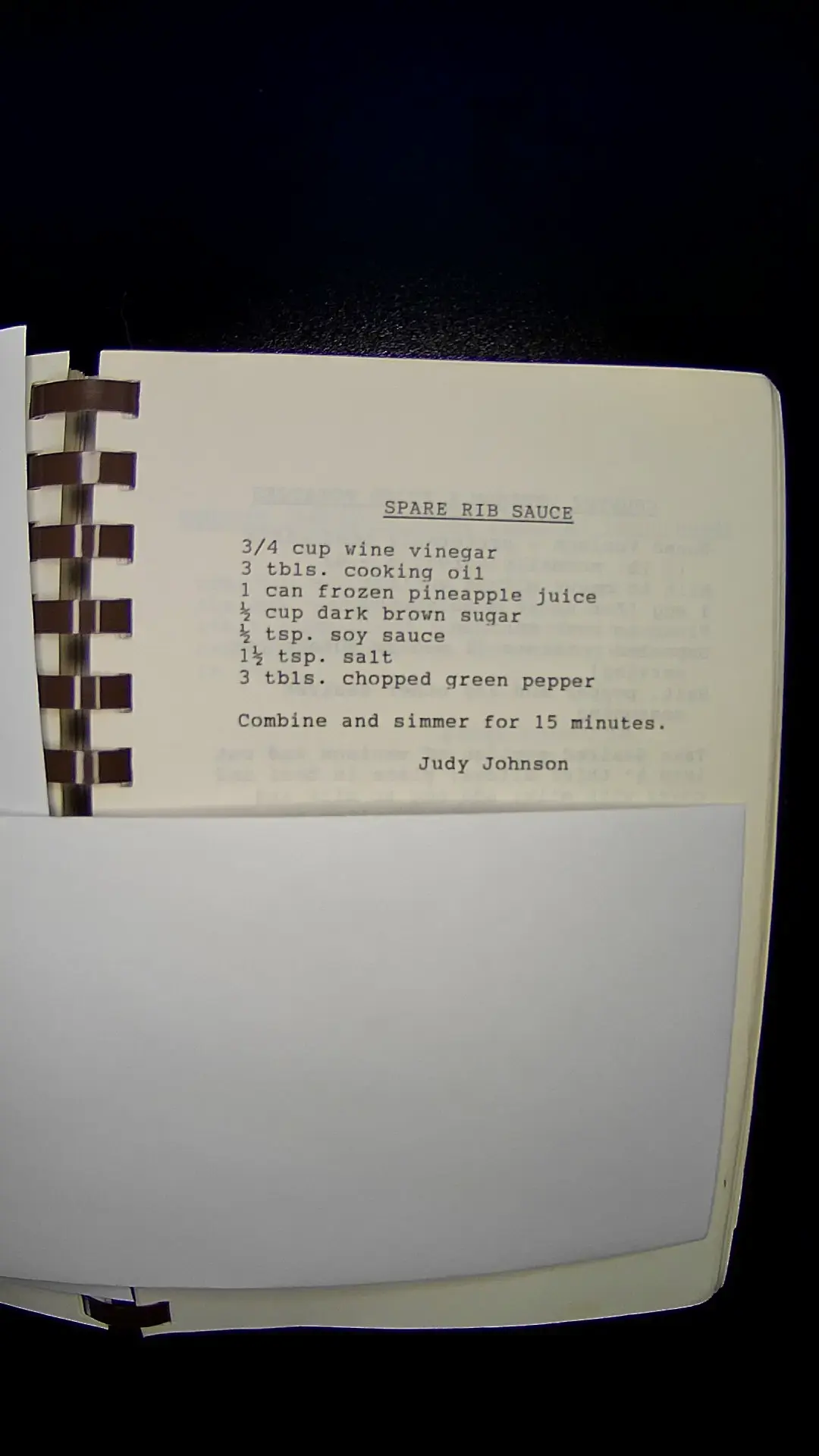 Here’s the text from the image: **SPARE RIB SAUCE** - 3/4 cup wine vinegar - 3 tbls. cooking oil - 1 can frozen pineapple juice - 1/2 cup dark brown sugar - 1/2 tsp. soy sauce - 1 1/2 tsp. salt - 3 tbls. chopped green pepper Combine and simmer for 15 minutes. **Judy Johnson**llm