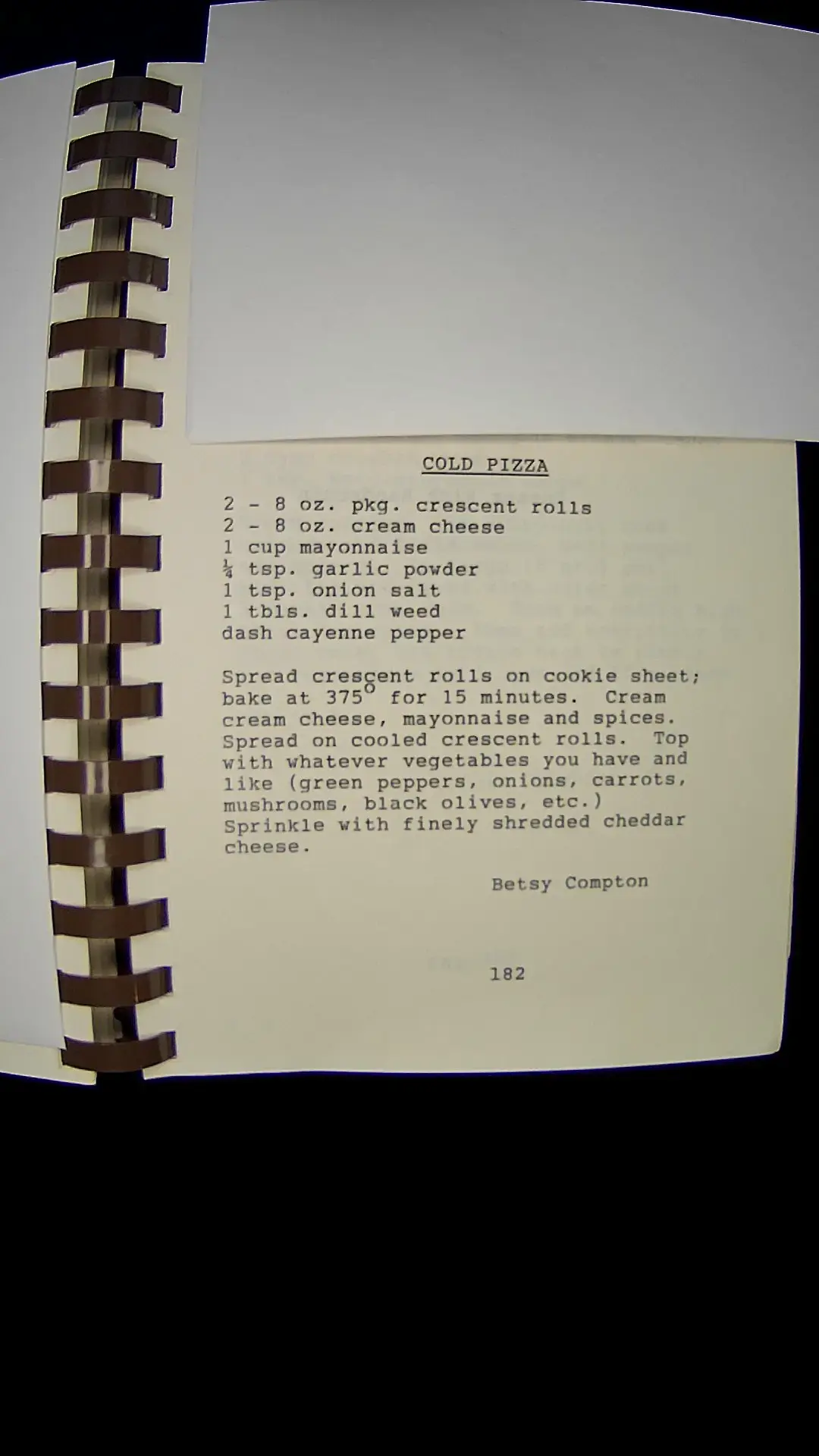 Here's the text from the image: --- **COLD PIZZA** 2 - 8 oz. pkg. crescent rolls 2 - 8 oz. cream cheese 1 cup mayonnaise ¾ tsp. garlic powder 1 tsp. onion salt 1 tbls. dill weed dash cayenne pepper Spread crescent rolls on cookie sheet; bake at 375°F for 15 minutes. Cream cream cheese, mayonnaise and spices. Spread on cooled crescent rolls. Top with whatever vegetables you have and like (green peppers, onions, carrots, mushrooms, black olives, etc.) Sprinkle with finely shredded cheddar cheese. Betsy Compton 182 ---llm
