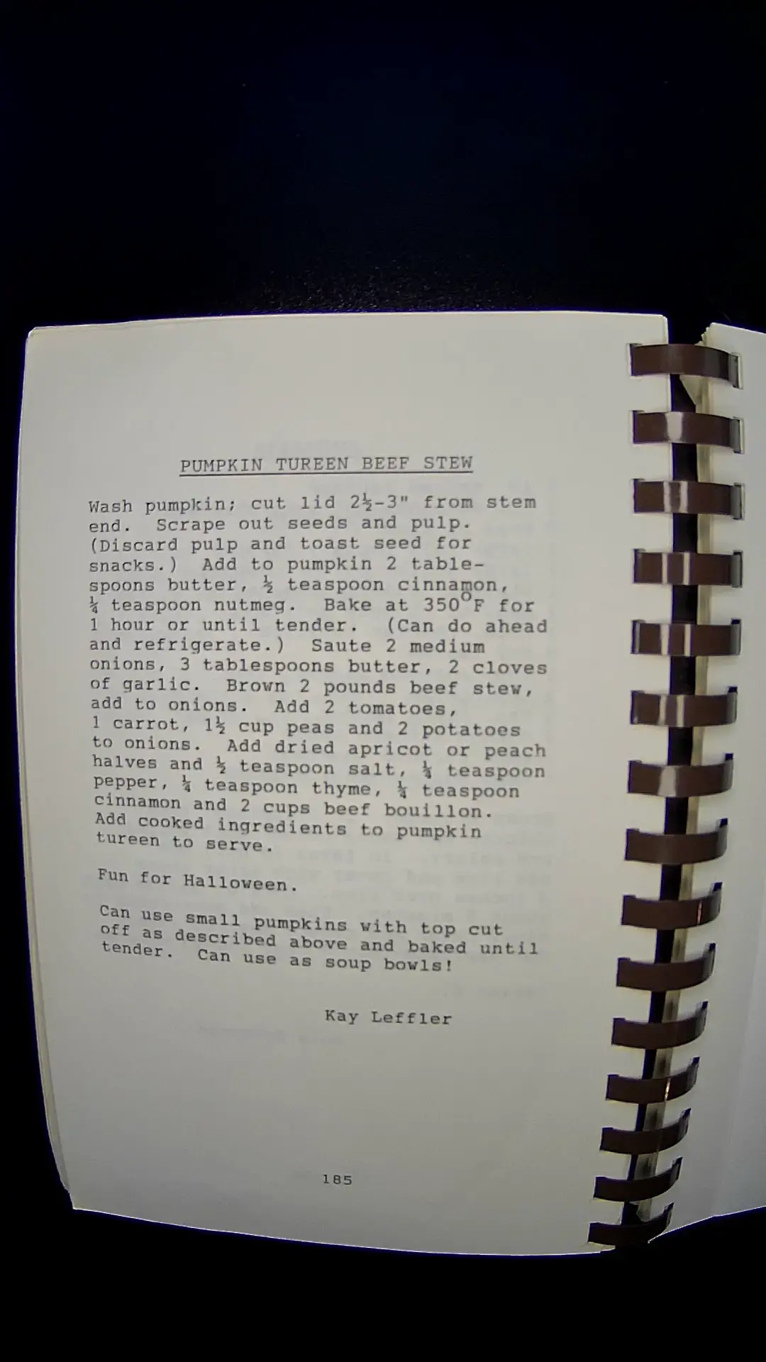 **PUMPKIN TUREEN BEEF STEW** Wash pumpkin; cut lid 2½-3" from stem end. Scrape out seeds and pulp. (Discard pulp and toast seeds for snacks.) Add to pumpkin 2 tablespoons butter, ½ teaspoon cinnamon, ¼ teaspoon nutmeg. Bake at 350°F for 1 hour or until tender. (Can do ahead and refrigerate.) Sauté 2 medium onions, 3 tablespoons butter, 2 cloves of garlic. Brown 2 pounds beef stew, add 2 tomatoes, 1 carrot, 1½ cup peas and 2 potatoes to onions. Add dried apricot or peach halves and ½ teaspoon salt, ¼ teaspoon pepper, ¼ teaspoon thyme, ¼ teaspoon cinnamon and 2 cups beef bouillon. Add cooked ingredients to pumpkin tureen to serve. Fun for Halloween. Can use small pumpkins with top cut off as described above and baked until tender. Can use as soup bowls! Kay Leffler 185llm