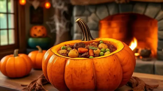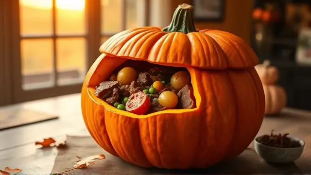 Combine and Serve: Once the stew is thick and flavors melded (about 1-1.5 hours), carefully transfer the mixture into the baked pumpkin. Serve directly from the pumpkin for a festive presentation!