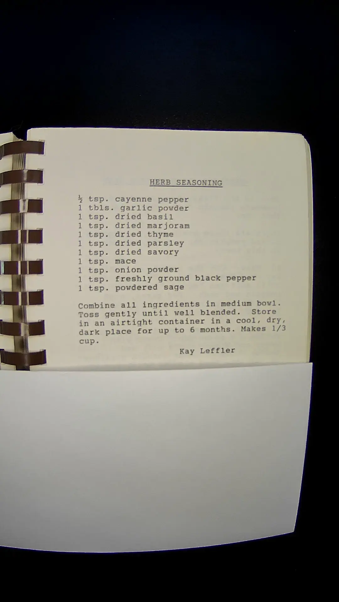 Here's the text from the image: **HERB SEASONING** - ½ tsp. cayenne pepper - 1 tbls. garlic powder - 1 tsp. dried basil - 1 tsp. dried marjoram - 1 tsp. dried thyme - 1 tsp. dried parsley - 1 tsp. dried savory - 1 tsp. mace - 1 tsp. onion powder - 1 tsp. freshly ground black pepper - 1 tsp. powdered sage Combine all ingredients in a medium bowl. Toss gently until well blended. Store in an airtight container in a cool, dry, dark place for up to 6 months. Makes ⅓ cup. Kay Lefflerllm