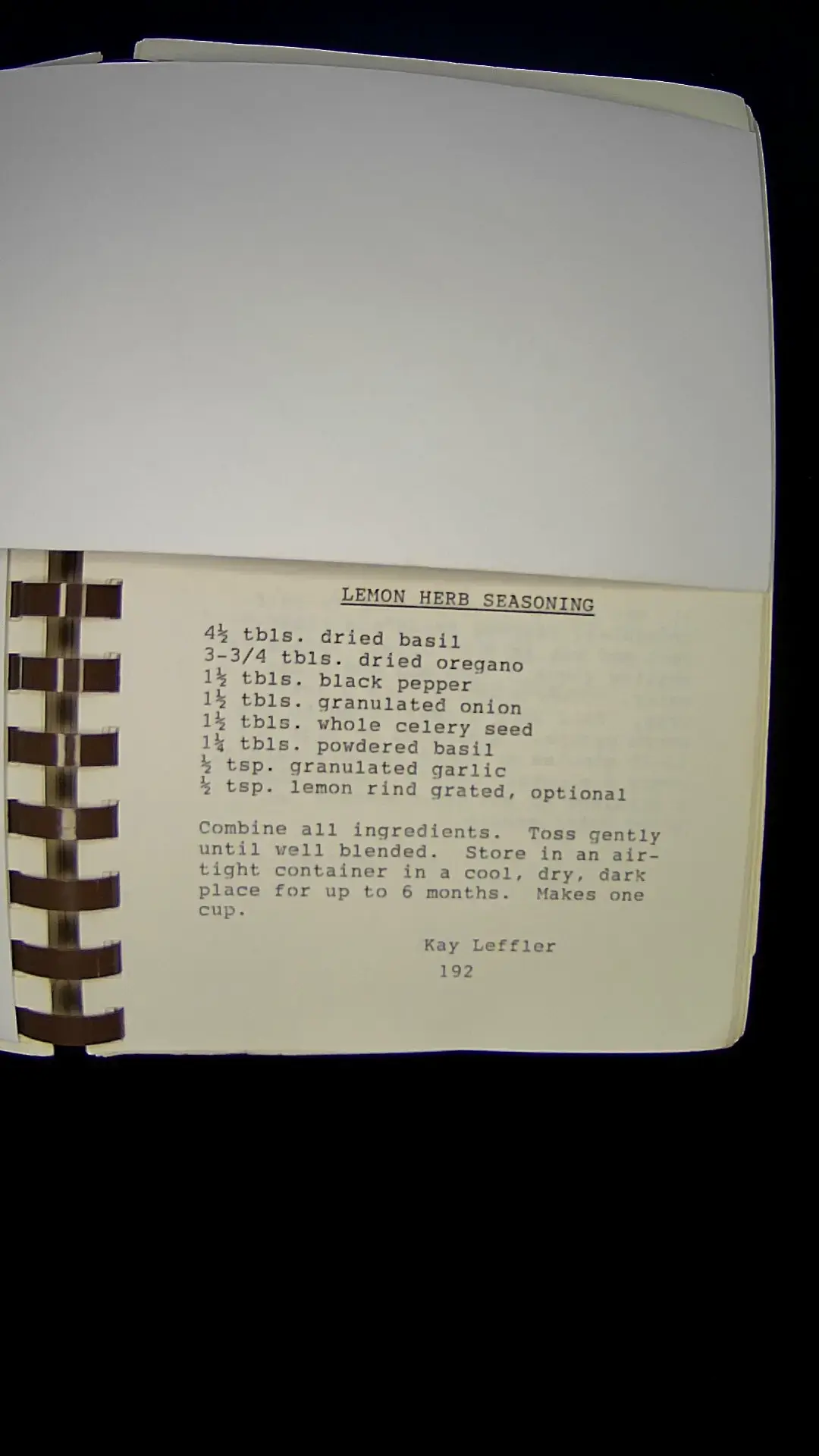 Here's the text from the image: **LEMON HERB SEASONING** 4½ tbls. dried basil 3¾ tbls. dried oregano 1½ tbls. black pepper 1½ tbls. granulated onion 1½ tbls. whole celery seed 1¼ tbls. powdered basil ½ tsp. granulated garlic ½ tsp. lemon rind grated, optional Combine all ingredients. Toss gently until well blended. Store in an airtight container in a cool, dry, dark place for up to 6 months. Makes one cup. Kay Leffler 192llm
