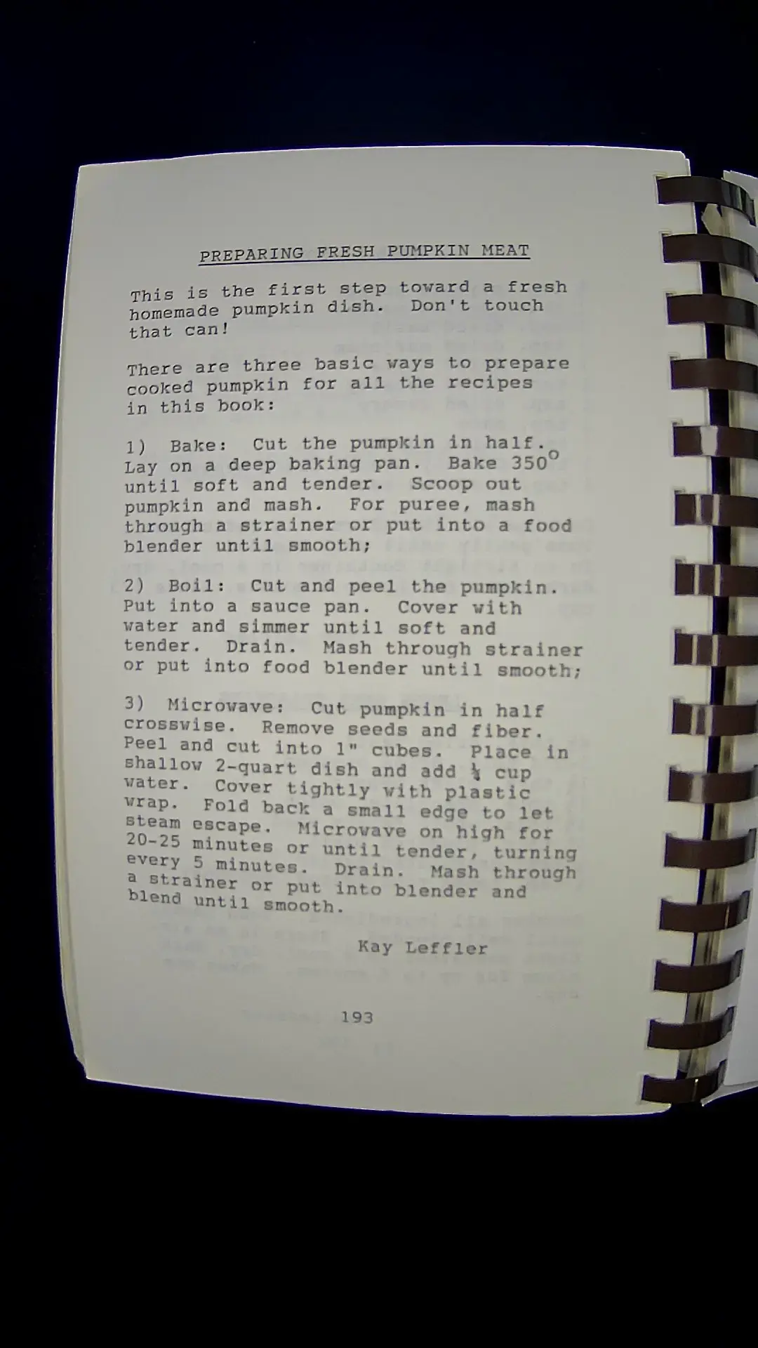 Sure! Here's the text from the image: --- **PREPARING FRESH PUMPKIN MEAT** This is the first step toward a fresh homemade pumpkin dish. Don't touch that can! There are three basic ways to prepare cooked pumpkin for all the recipes in this book: 1) **Bake:** Cut the pumpkin in half. Lay on a deep baking pan. Bake 350ΒΊ until soft and tender. Scoop out pumpkin and mash. For puree, mash through a strainer or put into a food blender until smooth; 2) **Boil:** Cut and peel the pumpkin. Put into a sauce pan. Cover with water and simmer until soft and tender. Drain. Mash through strainer or put into food blender until smooth; 3) **Microwave:** Cut pumpkin in half crosswise. Remove seeds and fiber. Peel and cut into 1" cubes. Place in shallow 2-quart dish and add Β½ cup water. Cover tightly with plastic wrap. Fold back a small edge to let steam escape. Microwave on high for 20-25 minutes or until tender, turning every 5 minutes. Drain. Mash through a strainer or put into blender and blend until smooth. Kay Leffler 193 --- Let me know if you need anything else!llm