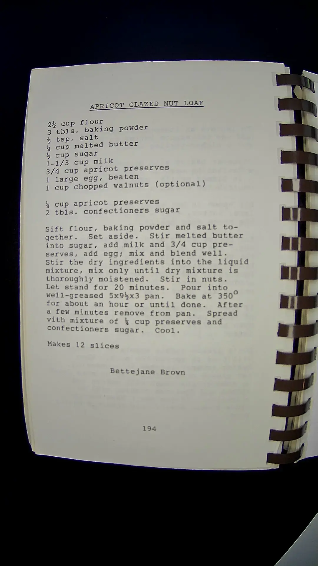 Here’s the text from the image: **APRICOT GLAZED NUT LOAF** 2½ cup flour 3 tbls. baking powder ½ tsp. salt ¾ cup melted butter ½ cup sugar 1-1/3 cup milk ¾ cup apricot preserves 1 large egg, beaten 1 cup chopped walnuts (optional) ½ cup apricot preserves 2 tbls. confectioners sugar Sift flour, baking powder, and salt together. Set aside. Stir melted butter into sugar, add milk and ¾ cup preserves, add egg; mix and blend well. Stir the dry ingredients into the liquid mixture, mix only until dry mixture is thoroughly moistened. Stir in nuts. Let stand for 20 minutes. Pour into well-greased 5x9x3 pan. Bake at 350°F for about an hour or until done. After a few minutes remove from pan. Spread with mixture of ½ cup preserves and confectioners sugar. Cool. Makes 12 slices **Bettejane Brown** 194llm