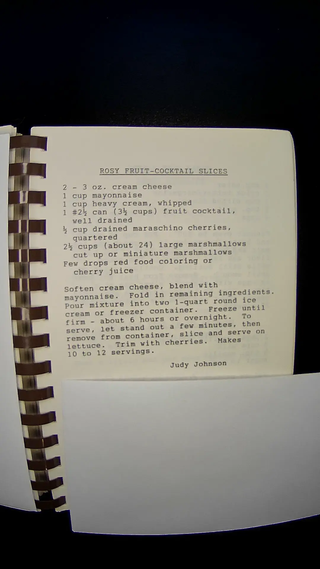 Here's the text from the image: **ROSY FRUIT-COCKTAIL SLICES** - 2 - 3 oz. cream cheese - 1 cup mayonnaise - 1 cup heavy cream, whipped - 1 #2½ can (3¾ cups) fruit cocktail, well drained - ½ cup drained maraschino cherries, quartered - 2½ cups (about 24) large marshmallows cut up or miniature marshmallows - Few drops red food coloring or cherry juice Soften cream cheese, blend with mayonnaise. Fold in remaining ingredients. Pour mixture into two 1-quart round ice cream or freezer containers. Freeze until firm - about 6 hours or overnight. To serve, let stand out a few minutes, then remove from container, slice and serve on lettuce. Trim with cherries. *Makes 10 to 12 servings.* Judy Johnsonllm